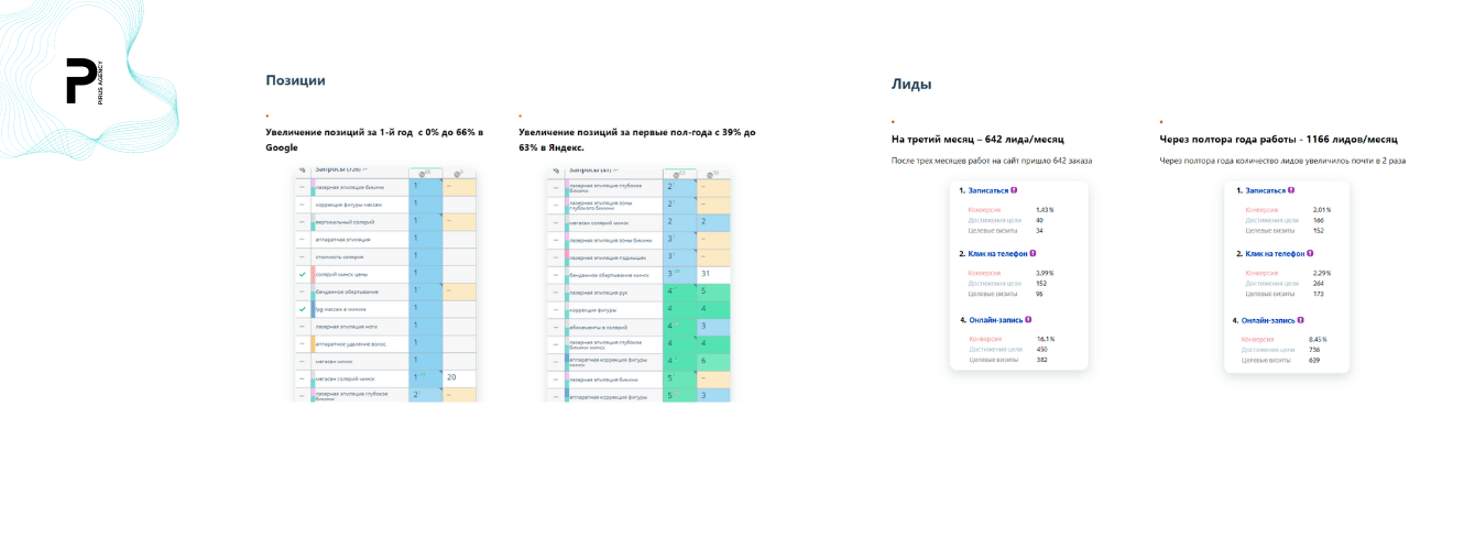 - Увеличение позиций с 0% до 66% в Google за первый год.
