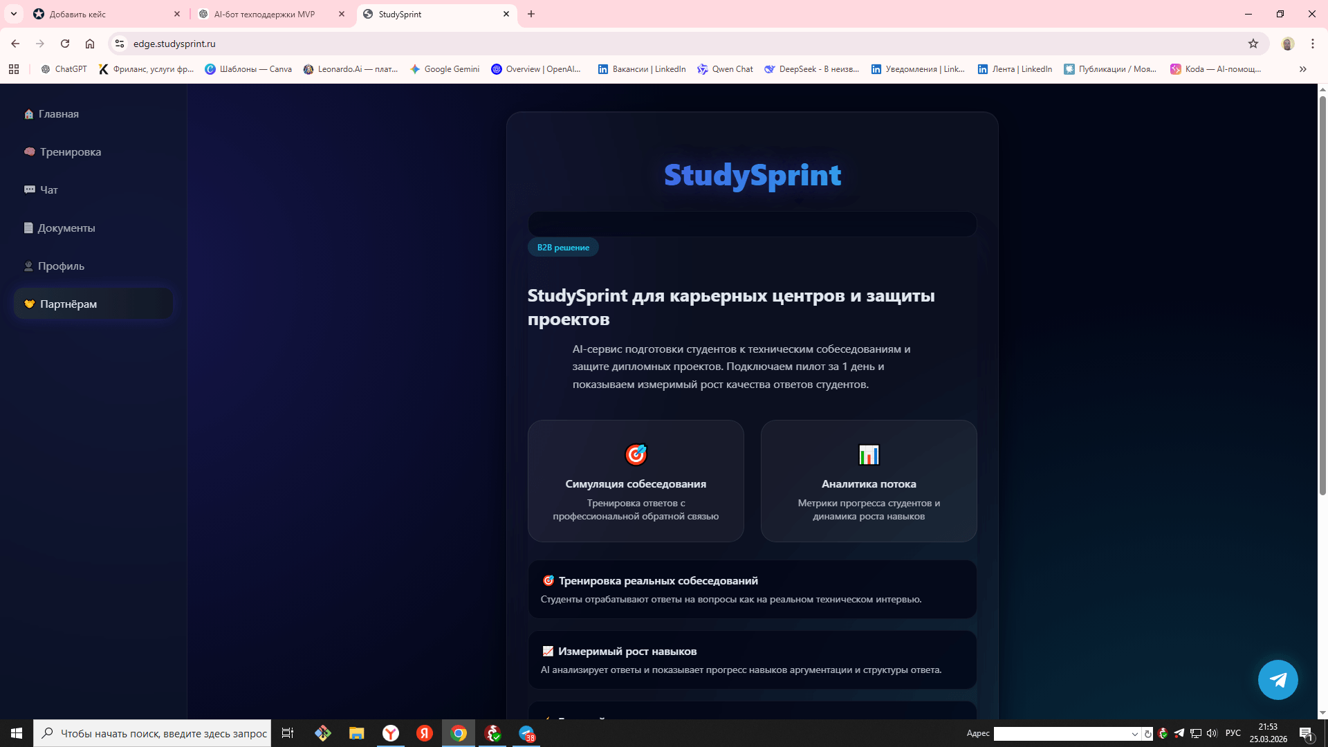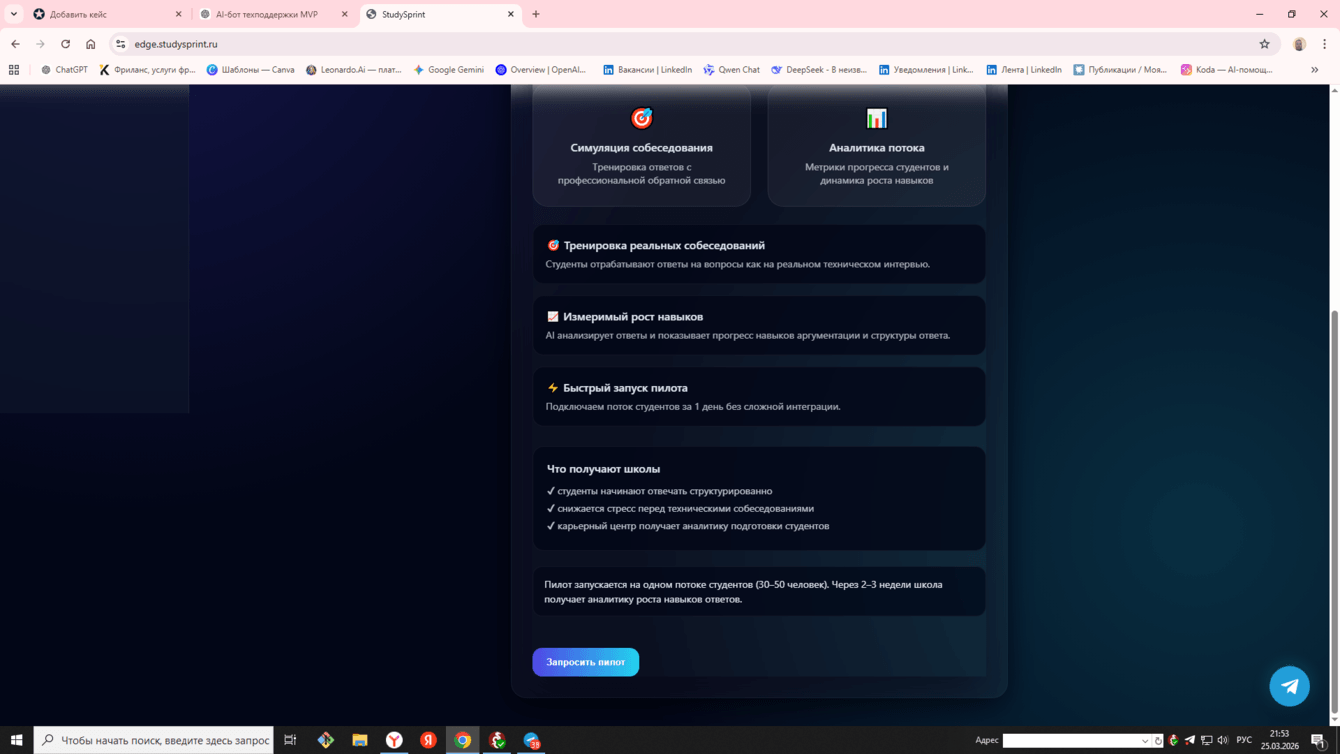 Собран единый backend-контур на Python/FastAPI с AI-логикой на базе OpenAI API. Реализованы web-интерфейс и Telegram-бот, сценарии тренировки, аналитика прогресса, работа с документами и серверное развёртывание. Проект развивается как AI-first MVP с возможностью поэтапного расширения.