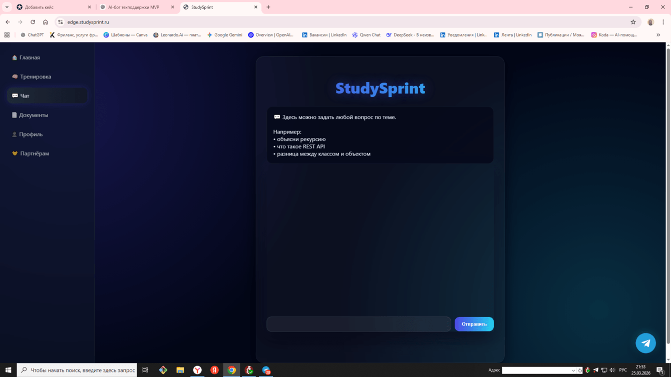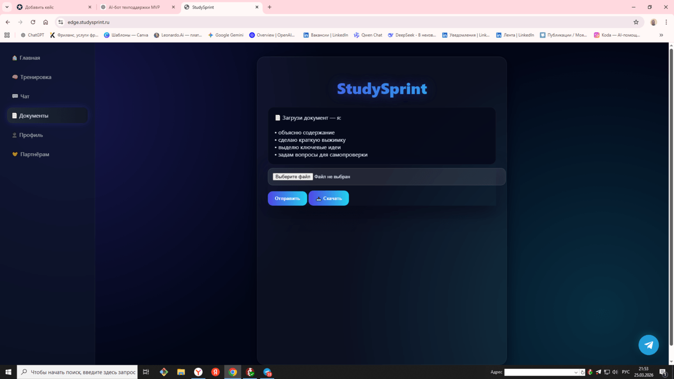 Получен рабочий AI-сервис с единым backend-контуром, web-интерфейсом и Telegram-ботом. Реализованы AI-тренировки, аналитика прогресса, работа с документами и базовая подписочная логика. Проект показывает практический подход к быстрому запуску AI-first MVP и его дальнейшему развитию по этапам.