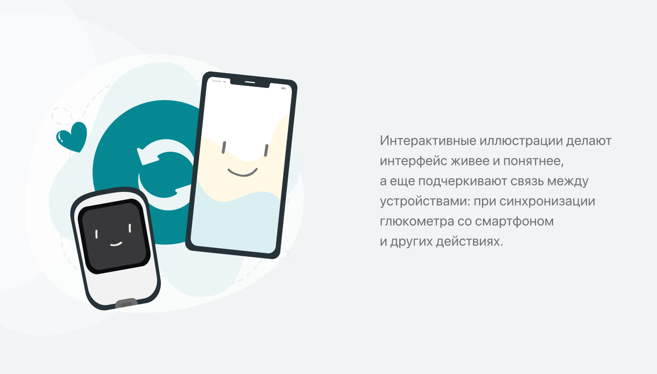 Мы создали чистый и интуитивно понятный дизайн, усилив его наглядными иллюстрациями, которые помогают пользователю ориентироваться в различных сценариях. Визуальная концепция сочетает фирменный стиль заказчика и промышленный дизайн глюкометров.