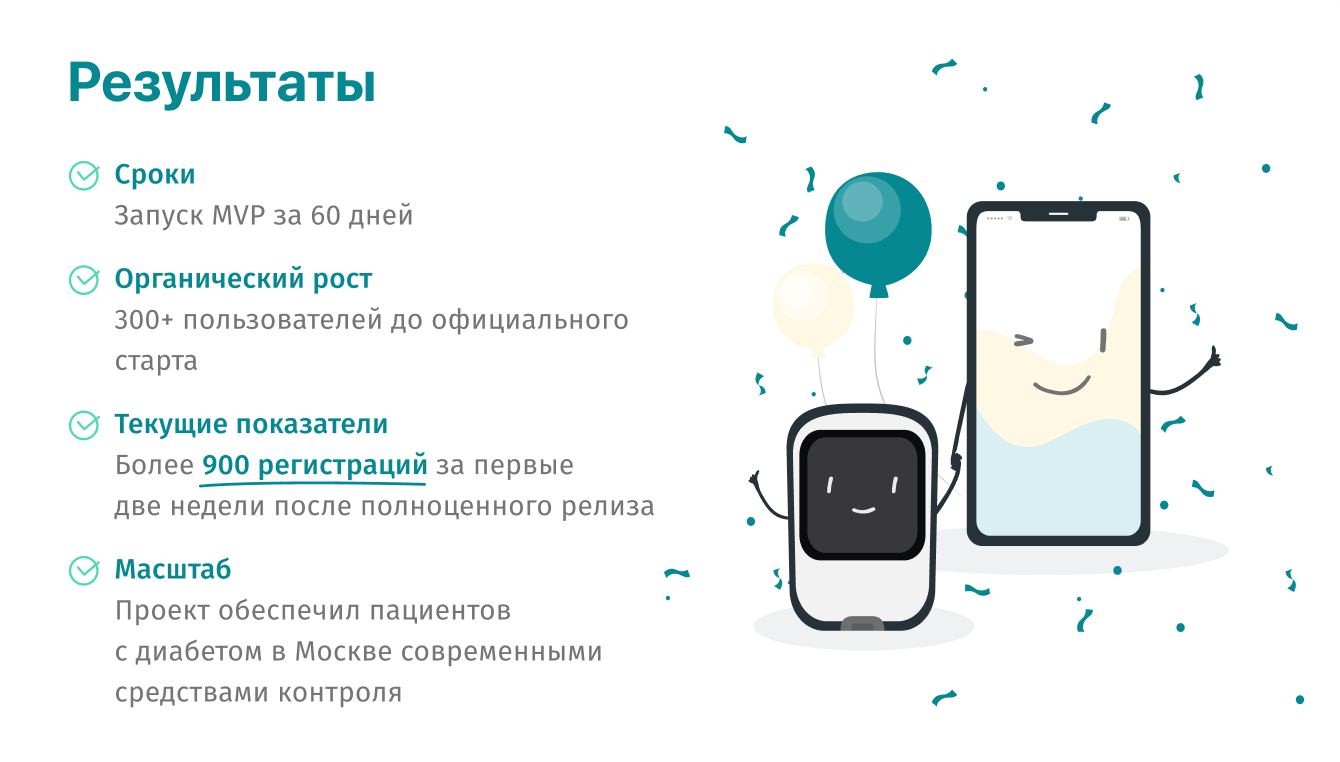 Наша задача: за 2 месяца разработать с нуля MVP для мониторинга уровня глюкозы в крови. При этом архитектура должна выдерживать ежегодный прирост в 10 000+ активных пользователей.