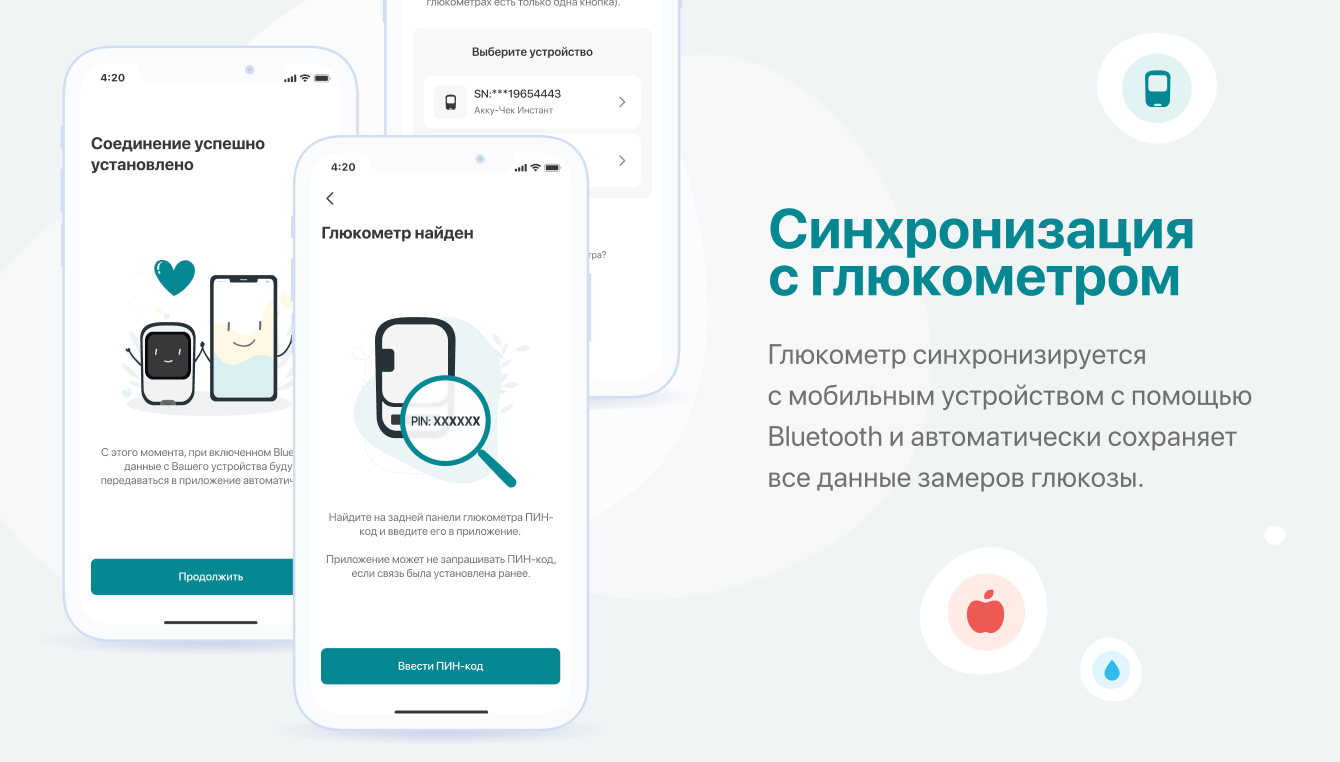 - Подключение глюкометра Accu-Chek Instant по Bluetooth;