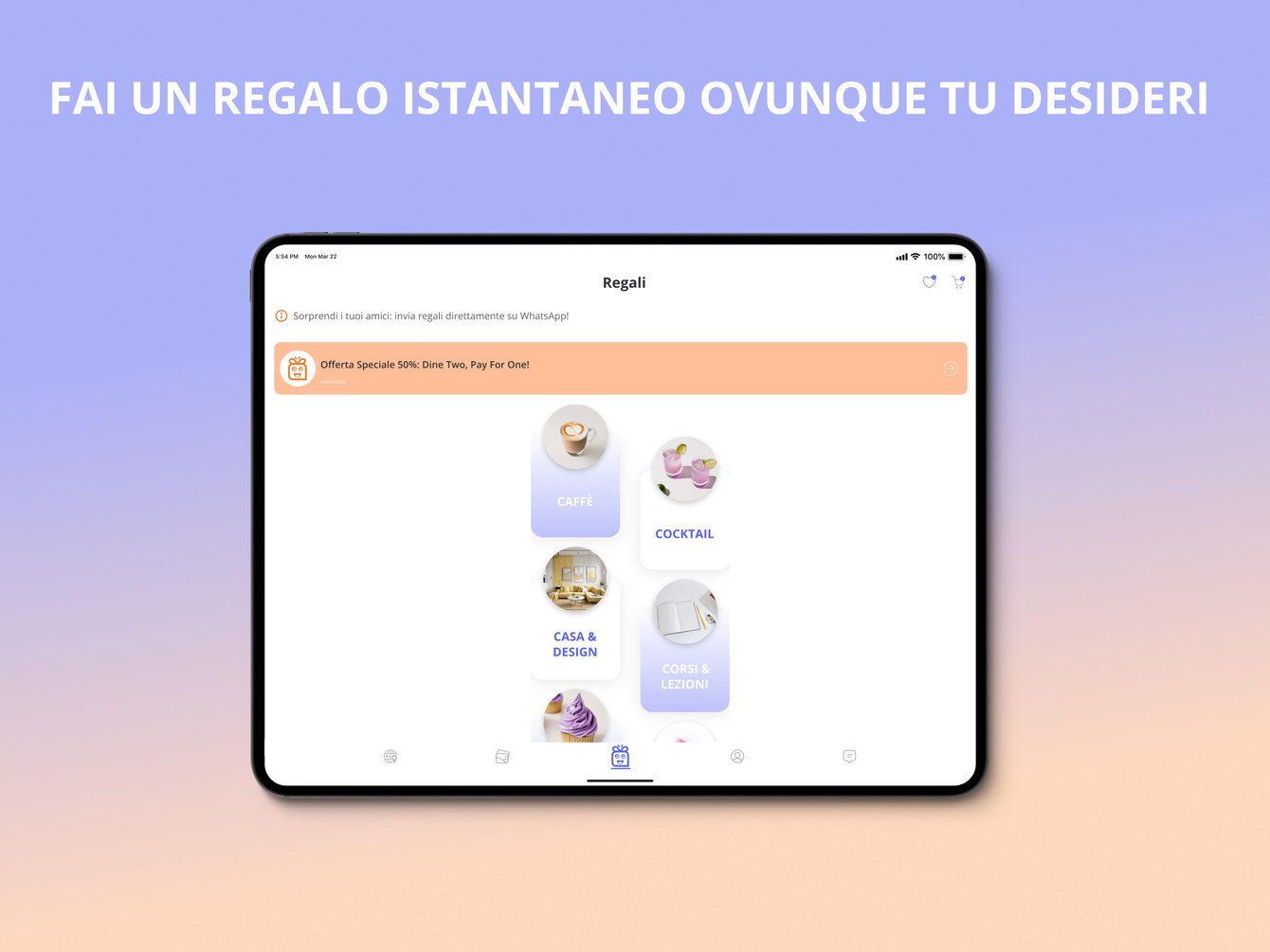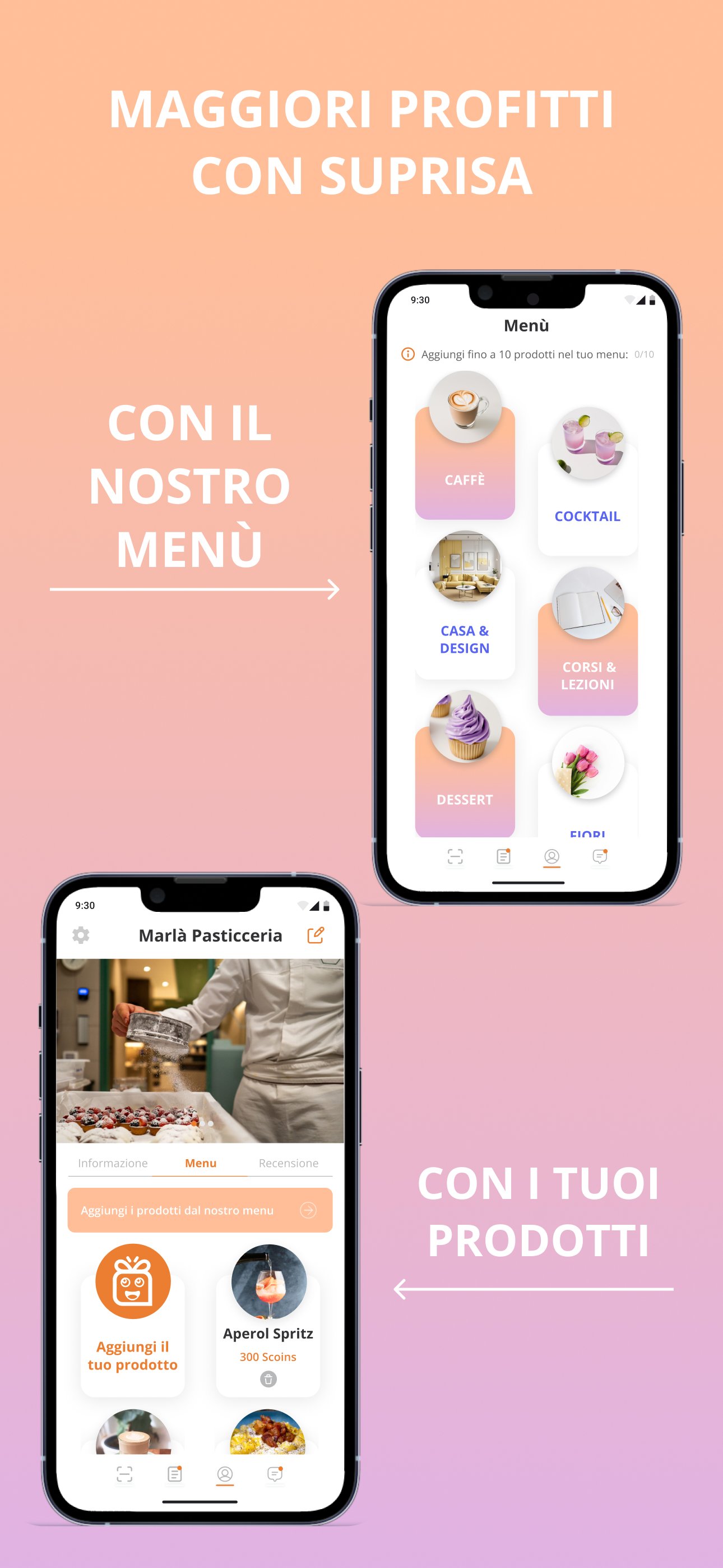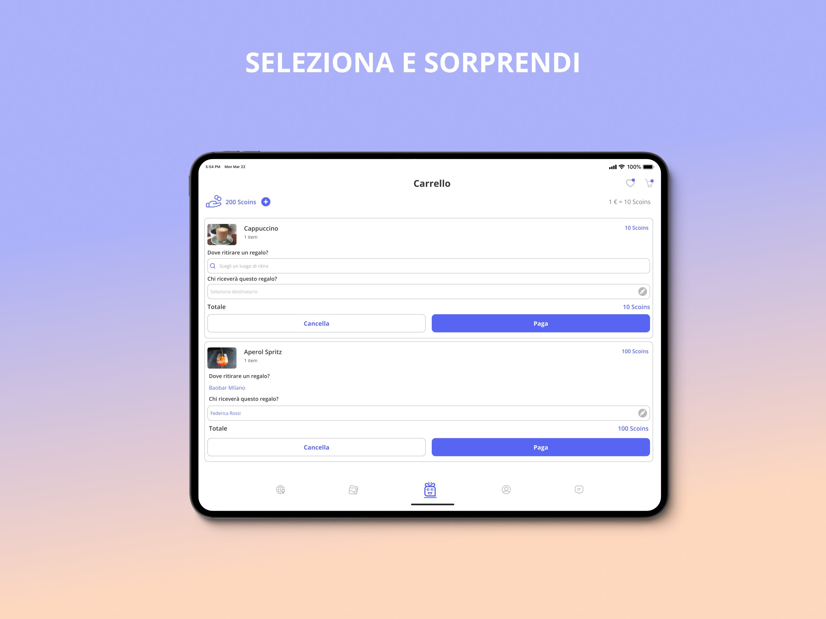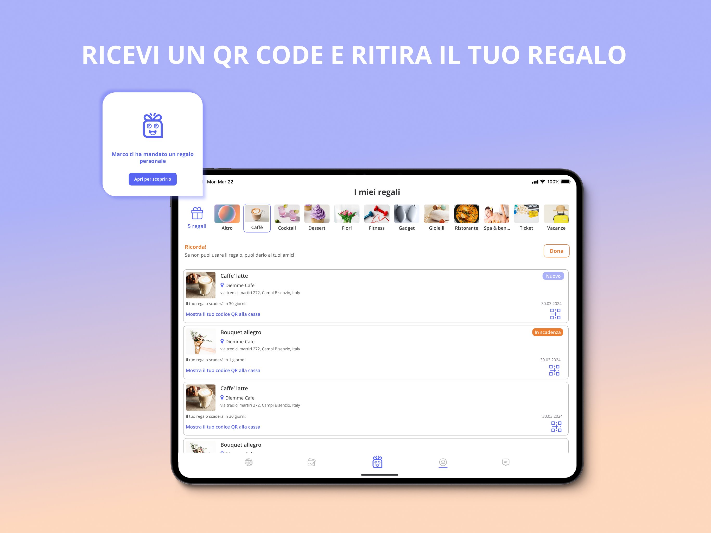 Необходимо было сделать приложение в котором будут разные заведения Италии, их товары для возможности внутри приложения дарить подарки пользователям. Подарки можно забрать в выбранном заведении отсканировав QR код