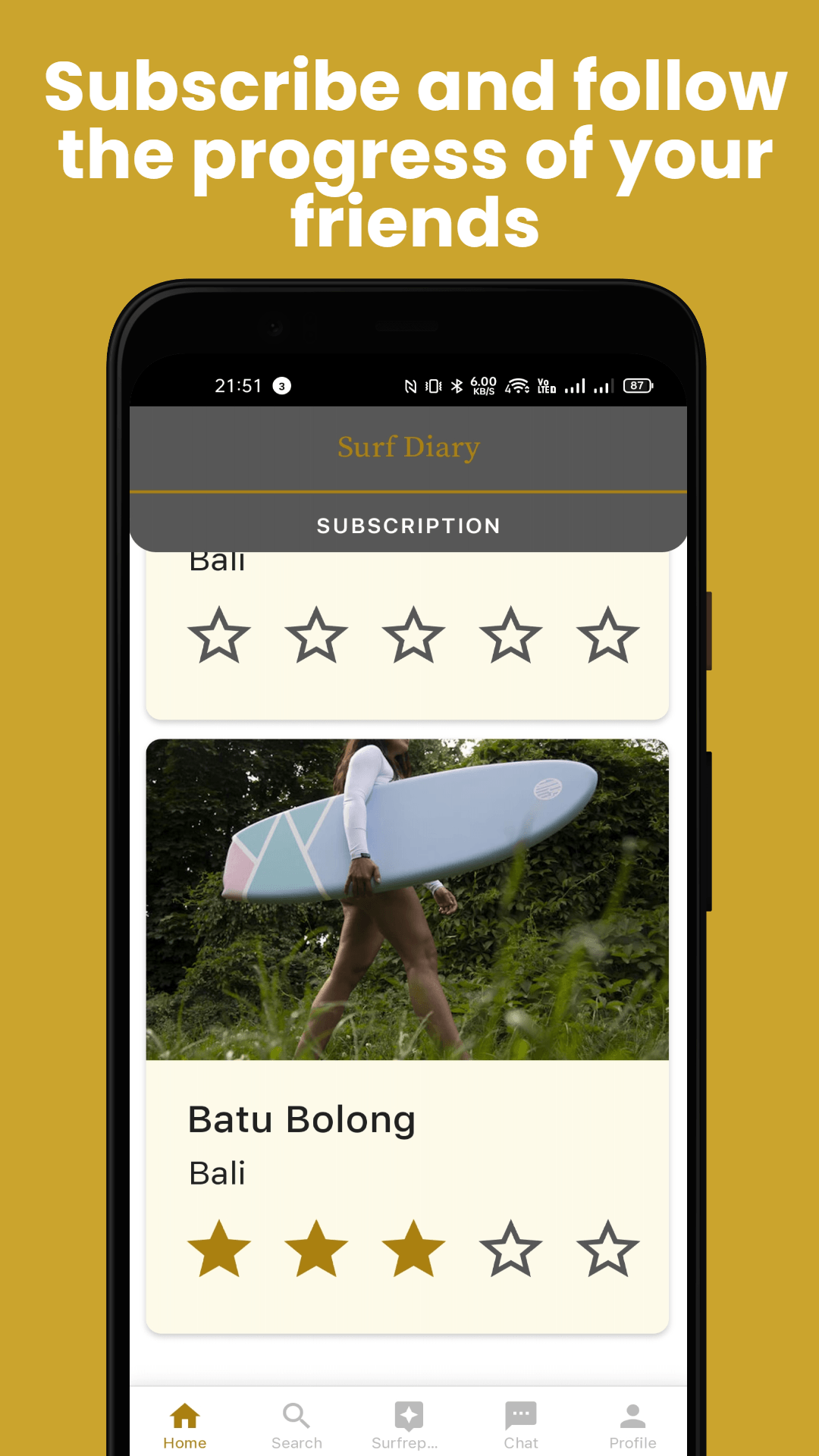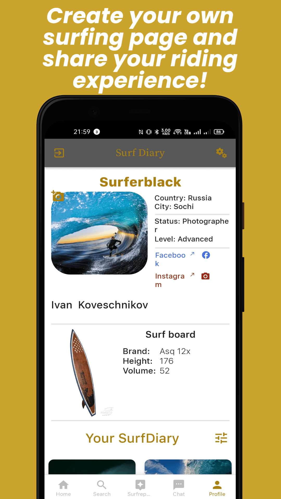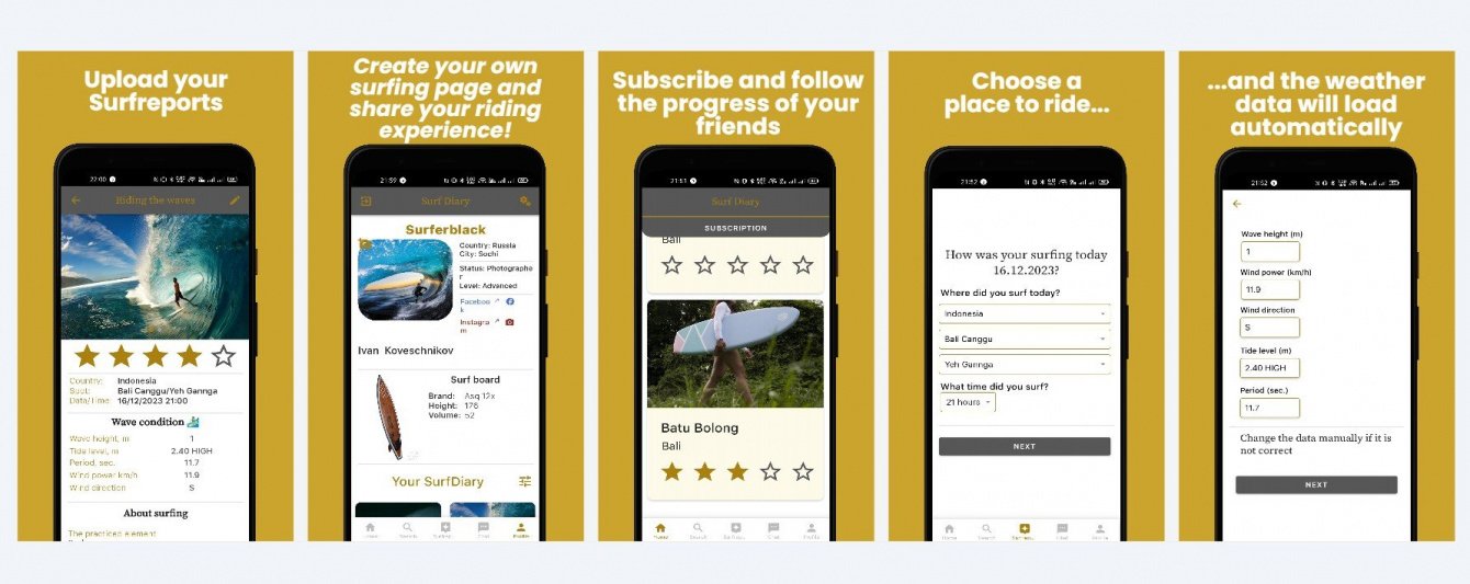 Клиенту потребовалось приложение для серфинга. Нужен был онлайн дневник в который бы вносилось то, как сегодня прошло катание или обучение, какая погода была(какая высота и скорость волны, направление и скорость ветра), которая бы автоматически подтягивалась при выборе места катания и времени катания. А так же была возможность вести свою страничку с выкладыванием фото катания, доски и другой информации о себе. Возможность подписываться на других пользователей, смотреть их публикации и общаться.