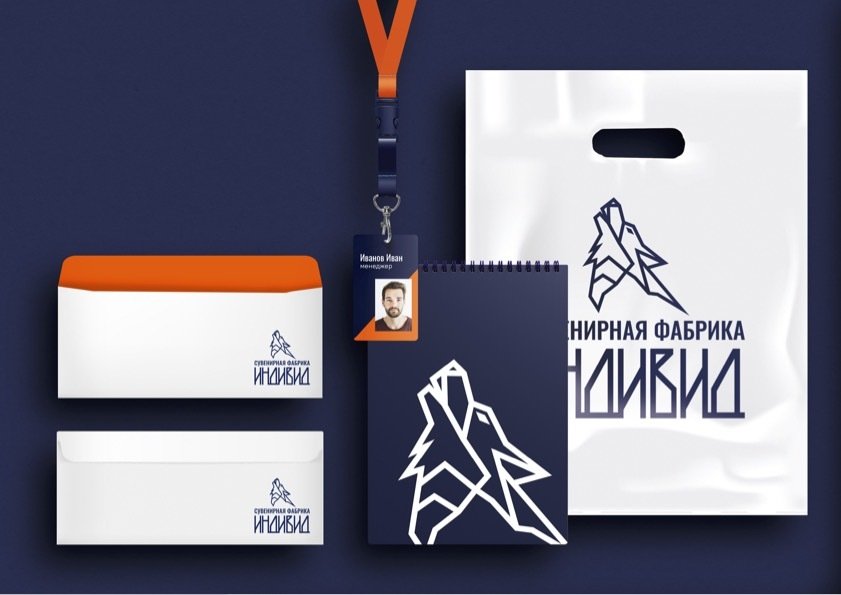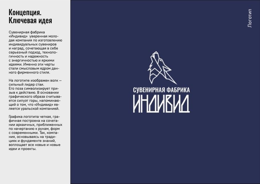 На логотипе изображен волк — сильный лидер стаи. Его поза символизирует призыв к действию. В основании графического образа считывается силуэт горы, напоминающий о том, что «Индивид» является уральской компанией.