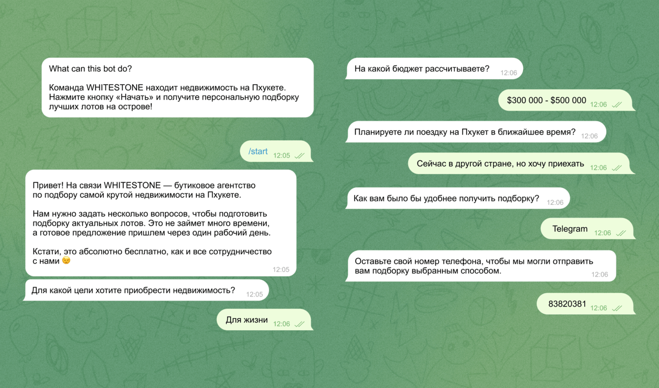 Важная черта инвесторов — они не любят медлить. Поэтому мы создали и запустили чат-бота, который подбирал потенциальным клиентам пул объектов для покупки: примерно то, что обычно предлагают риелторы после выматывающих телефонных звонков и «пяти рабочих дней».