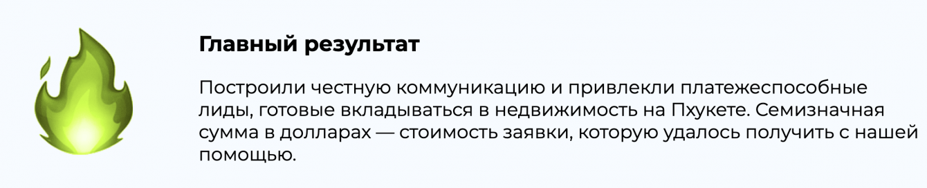 Сначала неоцифрованный, но заметный результат: за 4 месяца добились цели — получили признание в риелторском сообществе. Все это благодаря новому для ниши подходу: быть честными, простыми и своими даже на поприще элитной недвижимости.