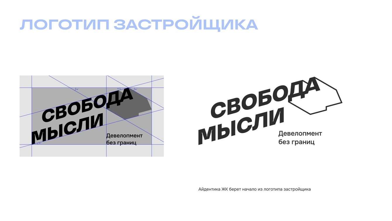 В айдентике мы связали застройщика и ЖК через визуальный акцент. Слово «ДА» стало самостоятельным графическим элементом в логотипе «СвобоДА Мысли».