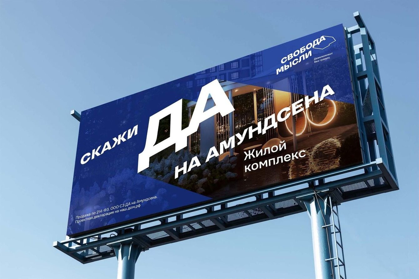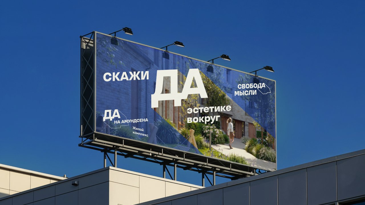 Мы создали бренд-платформу, где ценность свободы воплощена в нейминге. Короткое и емкое «ДА» стало ключевым элементом коммуникации. Логотипы ЖК используют тот же принцип «ДА», но с адаптацией под локацию («Да, на Амундсена»).
