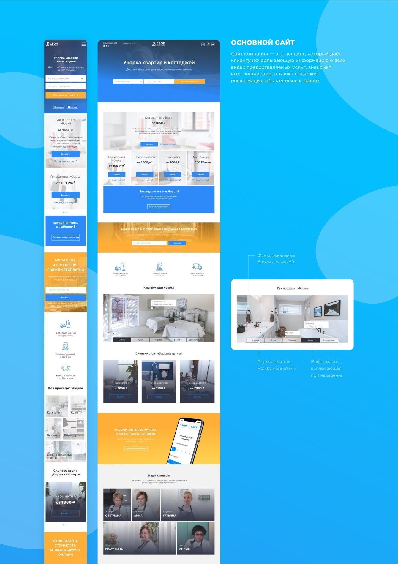 Сайт имеет удобную функцию бронирования. Информацию о видах уборки мы представили в виде всплывающих окон, что позволило не перегружать сайт, но при этом ответить на все вопросы, возникающие у клиента.