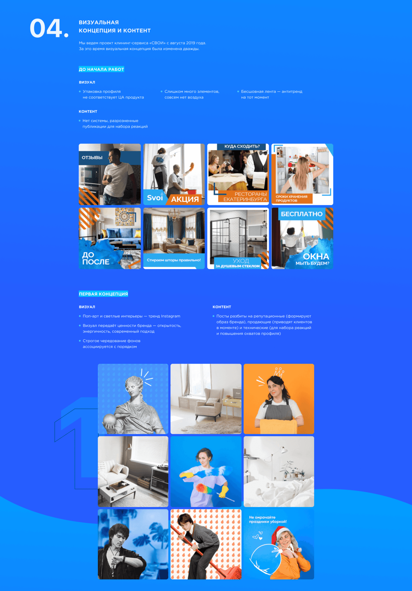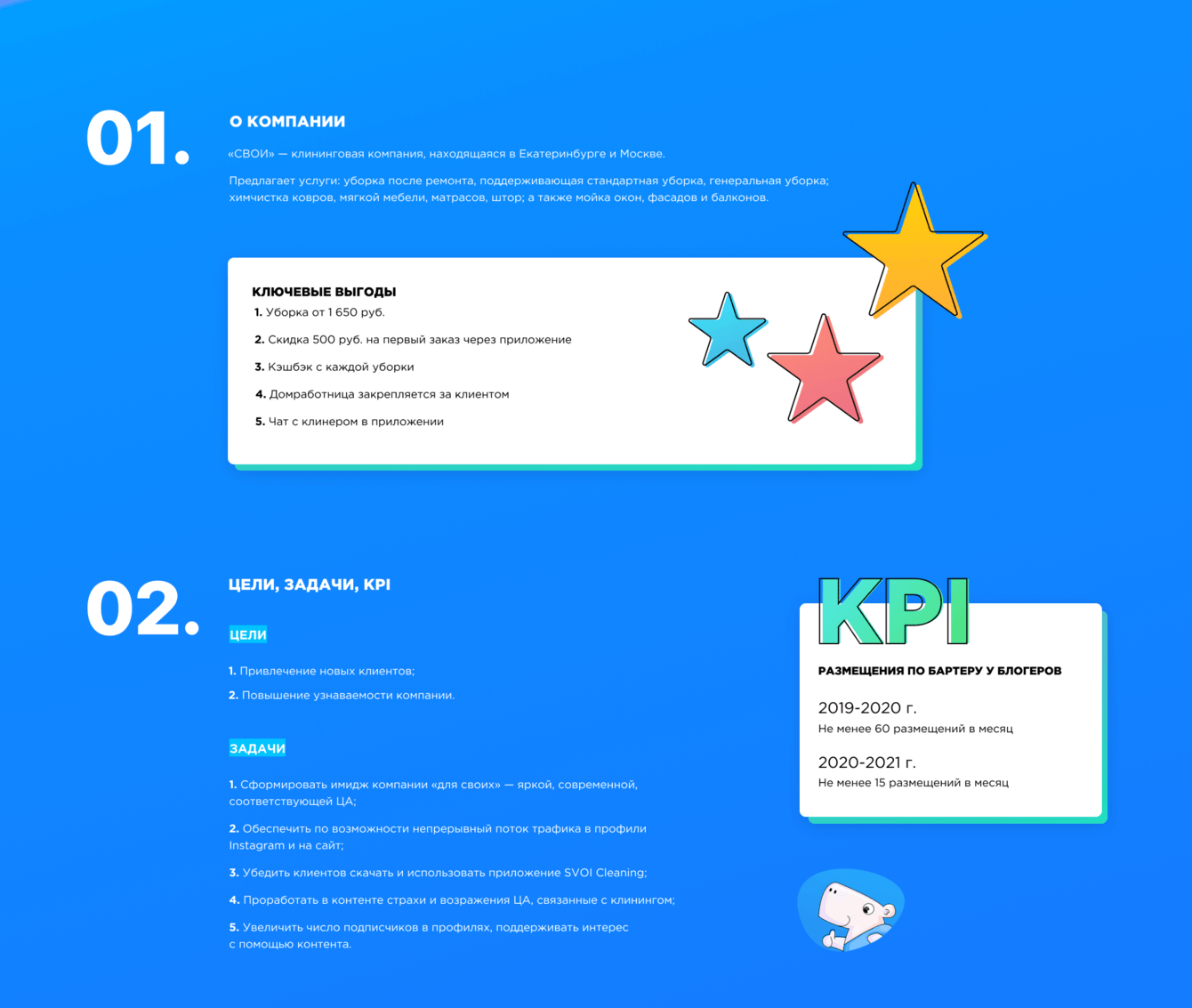 Цели рекламной кампании: привлечение новых клиентов, повышение узнаваемости компании. Задачи: сформировать имидж компании «для своих» — яркой, современной, соответствующей ЦА, обеспечить по возможности непрерывный поток трафика в профили Instagram и на сайт, убедить клиентов скачать и использовать приложение SVOI Cleaning, проработать в контенте страхи и возражения ЦА, связанные с клинингом, увеличить число подписчиков в профилях, поддерживать интерес с помощью контента.
