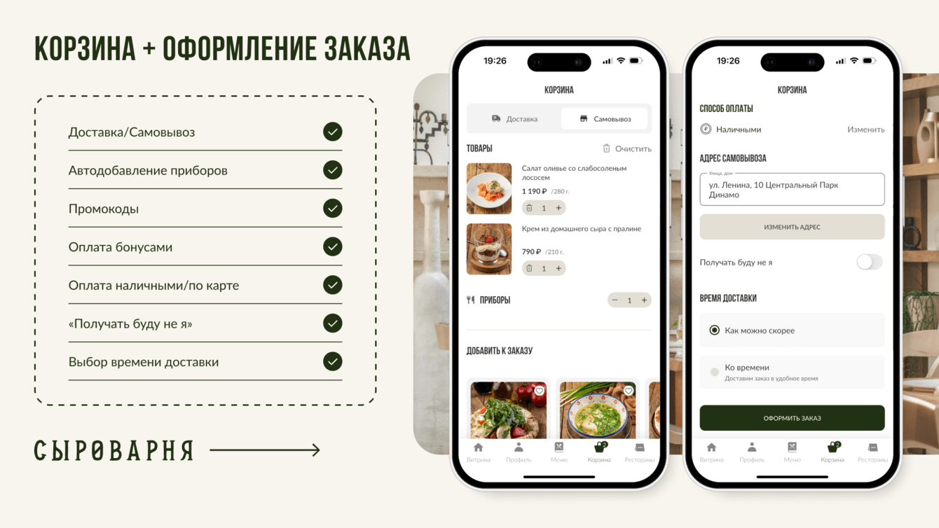 - Инновационный UX: нет отдельного экрана оформления заказа