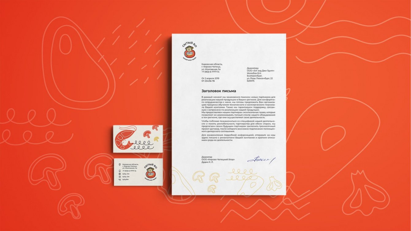 Логотип в виде улыбчивого упитанного азиата с большой тарелкой лапши в руках рассказывает о главном специалитете и гостеприимности кафе. Персонаж на логотипе вызывает симпатию и снижает тревожность у первых покупателей. Логотип дополнен паттерном, состоящим из стилизованных ингредиентов WOK-лапши. Рыба, мясо, чеснок, перец и другие ингредиенты показаны яркими пятнами и соединяются в единый рисунок. Графика удачно сочетается с пятном логотипа и наглядно демонстрирует наполнение