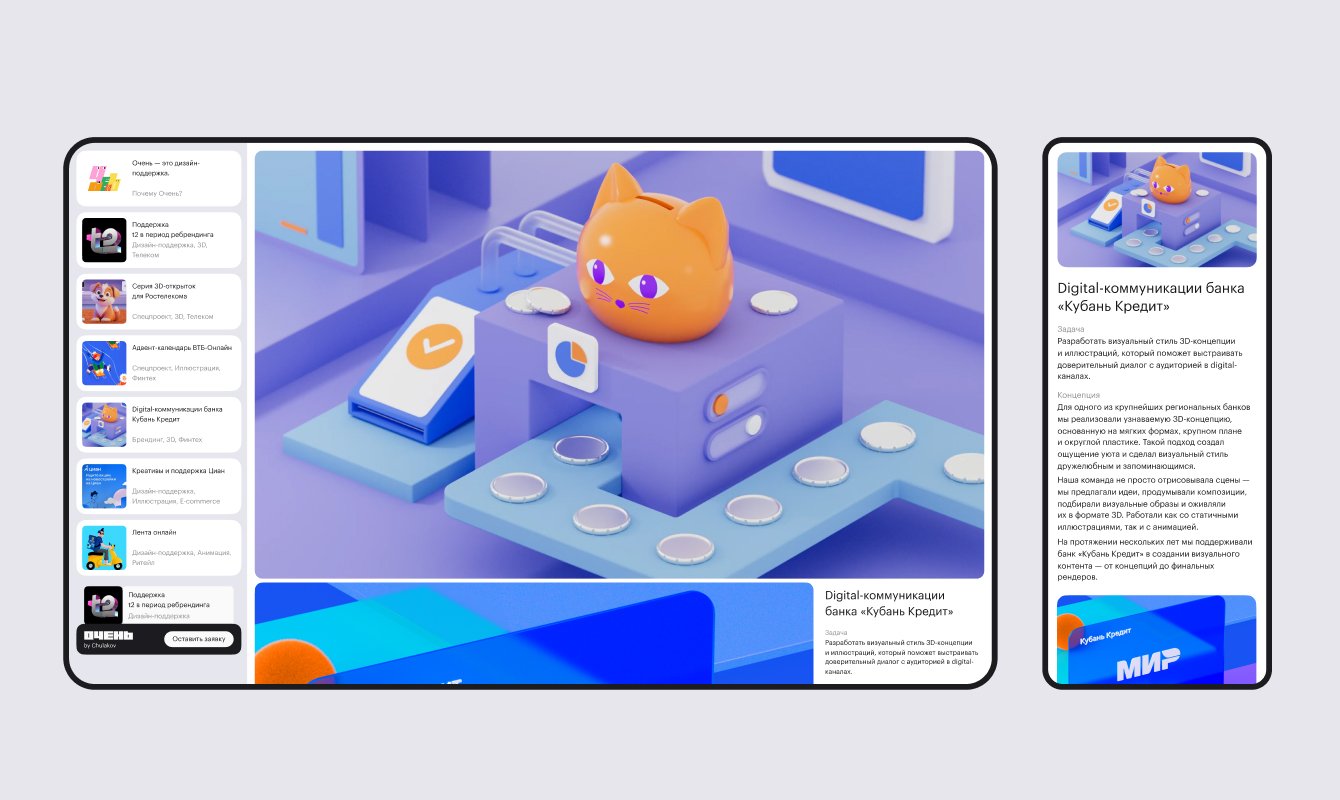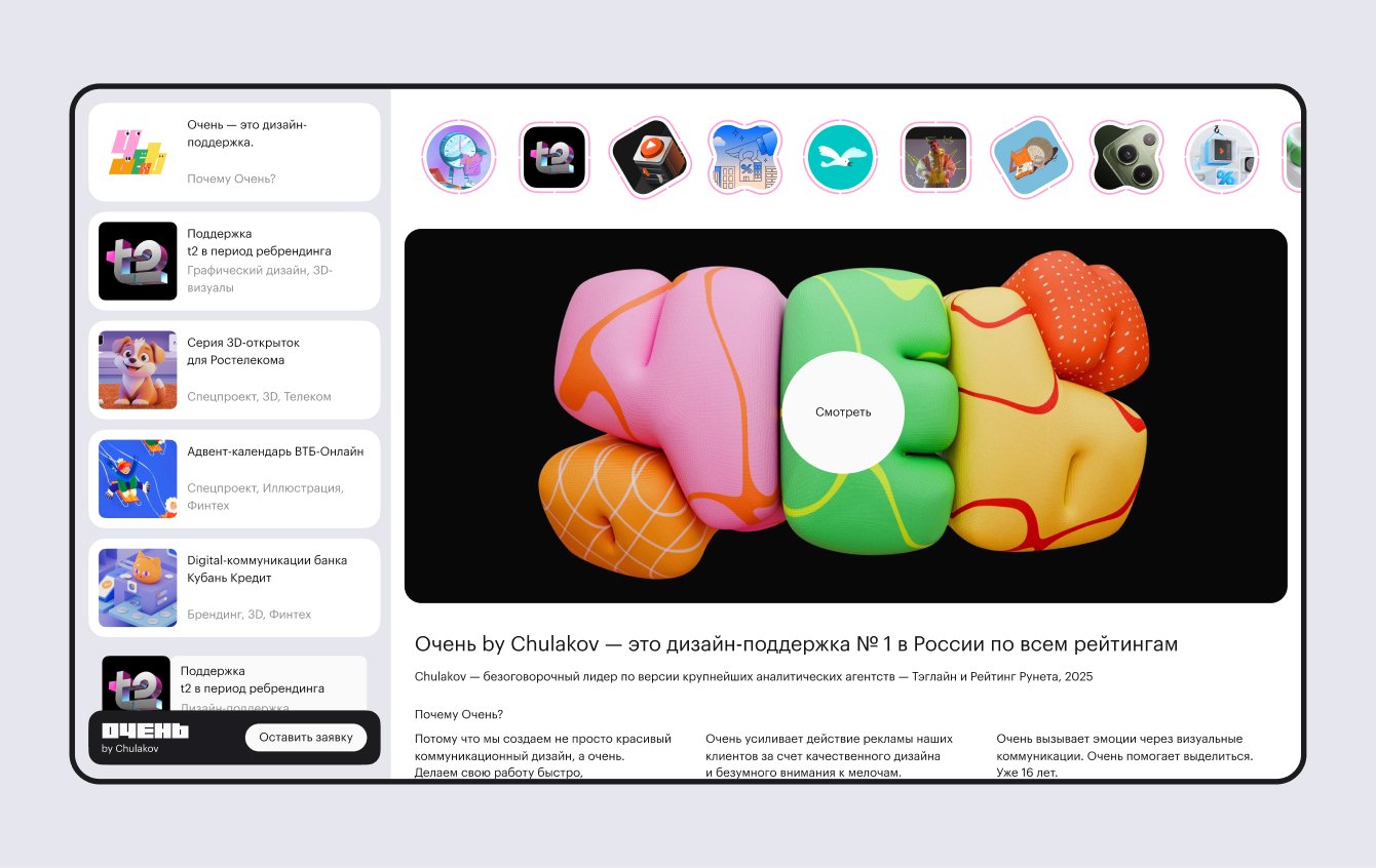 В кейсах сделали акцент на контент. Для оживления страницы добавили элементы, выходящие за границы экранов. Теперь сайт Очень by Chulakov — больше, чем просто портфолио для творческой команды.