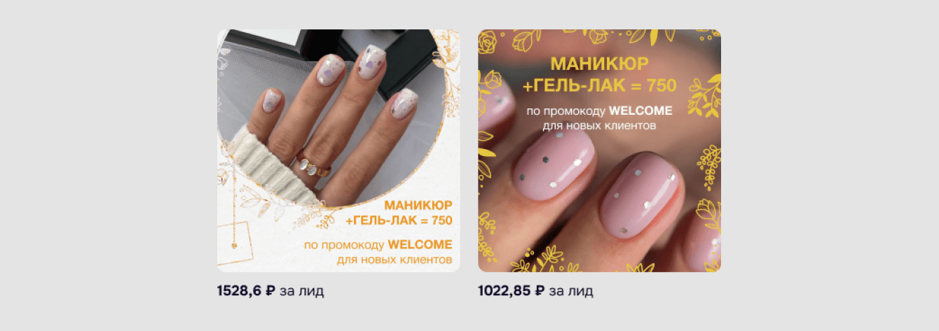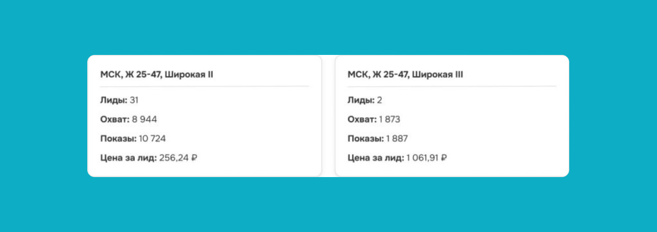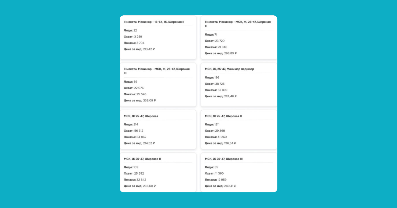 При увеличении дневного бюджета начинала повышаться цена за заявку. Чтобы этого избежать, делали дубли аудиторий “Широкая” и “Маникюр педикюр”.