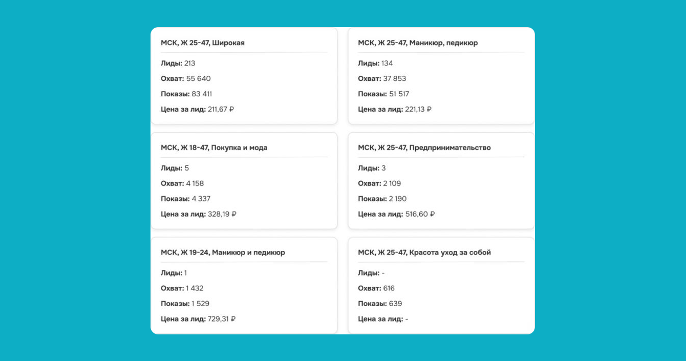 Интересы “покупка, мода, уход за собой” также не дали лиды по приемлемой цене и были отключены. С аудиториями “Широкая” и “Маникюр педикюр” будем дальше работать.