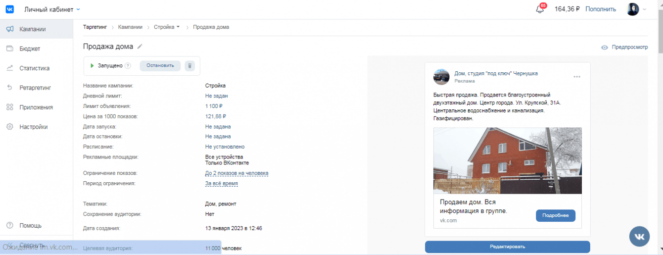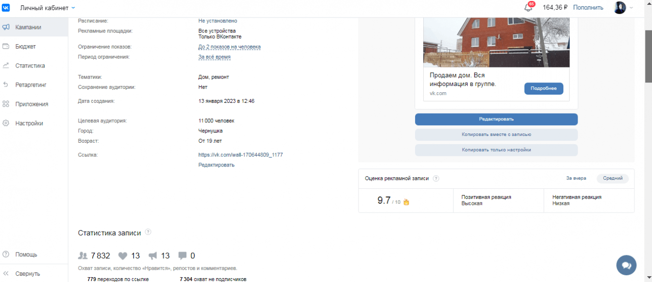 Запустить объявление через рекламу в ВК о продаже дома. Добавочная задача - подписка в группу по строительству.