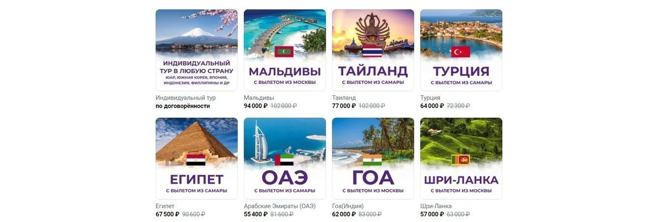 Карточки товаров. Здесь важно привлечь визуальное внимание. Разместили красочные фотографии туристических локаций с указанием названия страны и города вылета, так как это важно для клиента при выборе тура.