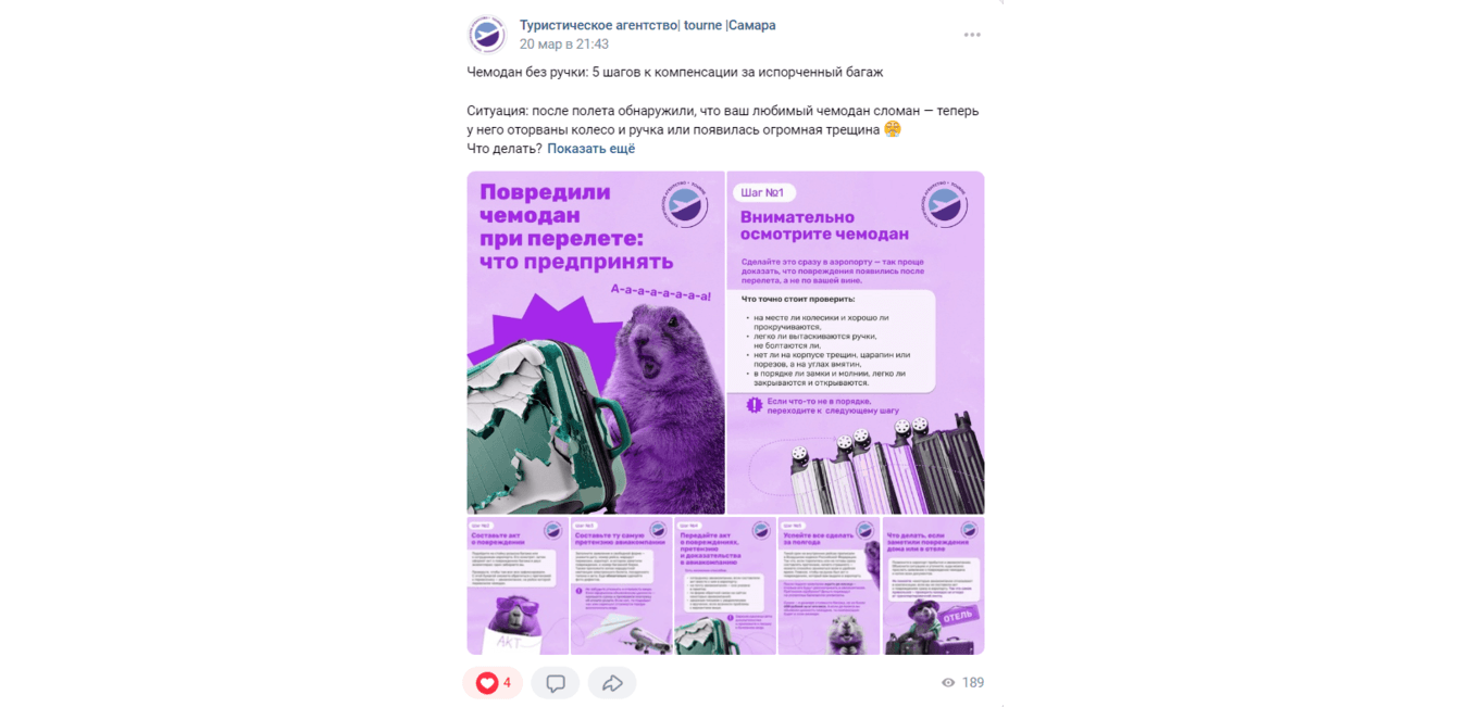 Контент нужен, чтобы рассказать о выгодах туроператора и УТП. Например, клиент предлагал рассрочку на туры и помогал сэкономить десятки тысяч рублей на поездке, благодаря грамотно подобранному маршруту и знанию нюансов каждого путешествия. Этот тип контента — продающий. С ним важно не переборщить, такого контента должно быть не более 20%.