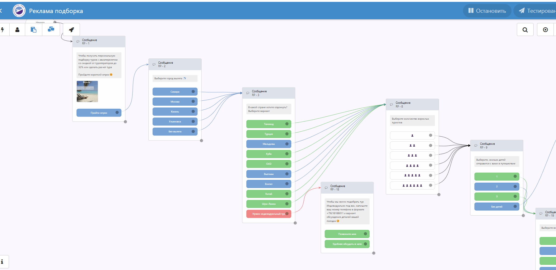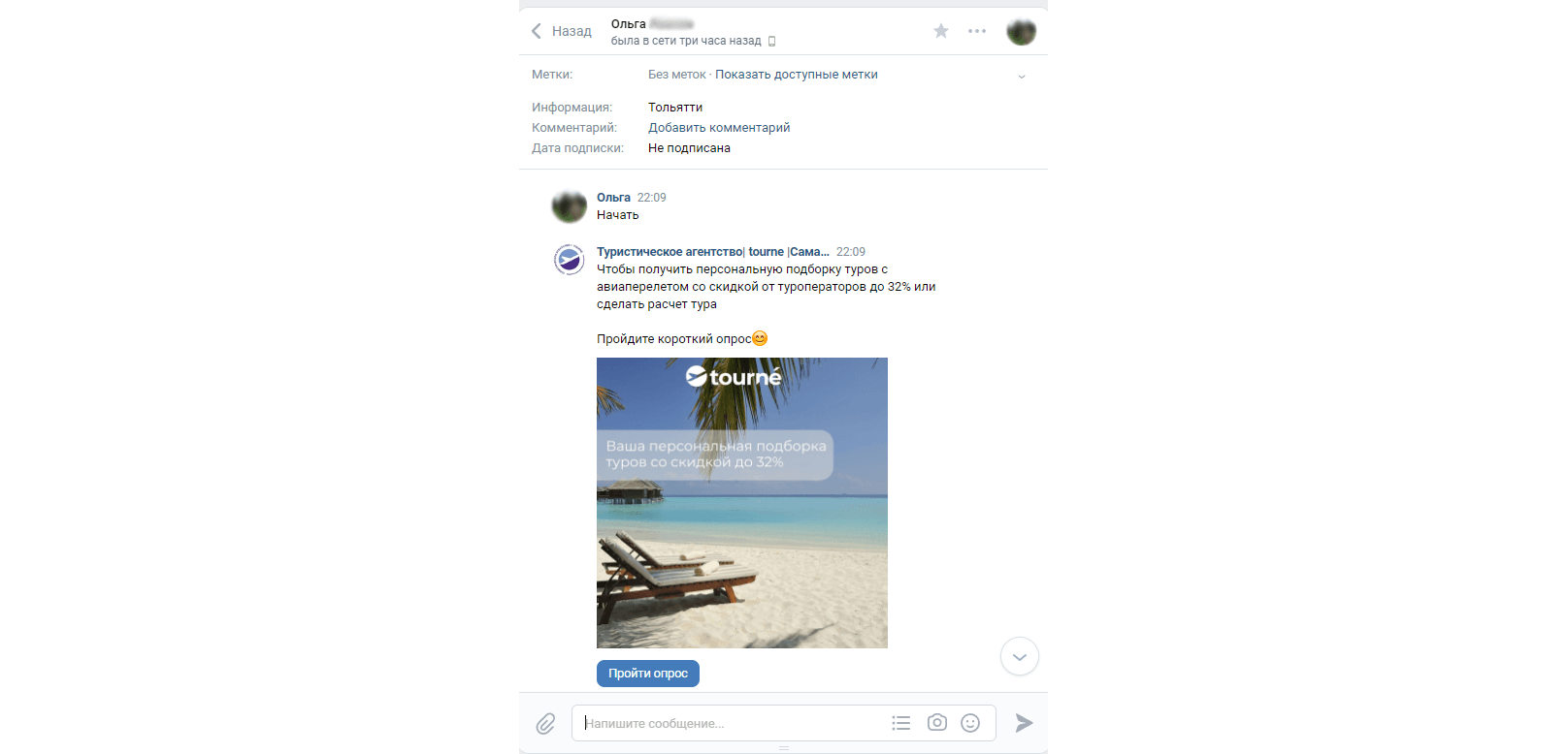 Это стало точкой входа в автоворонку. Далее предлагалось подобрать тур в самом чат-боте путем анкетирования. После нажатия кнопки «Пройти опрос» автоматически задавались вопросы, одним из которых был номер телефона. После его отправки менеджер моментально связывался с клиентом и присылал подборку отелей или туров под его бюджет в личные сообщения.