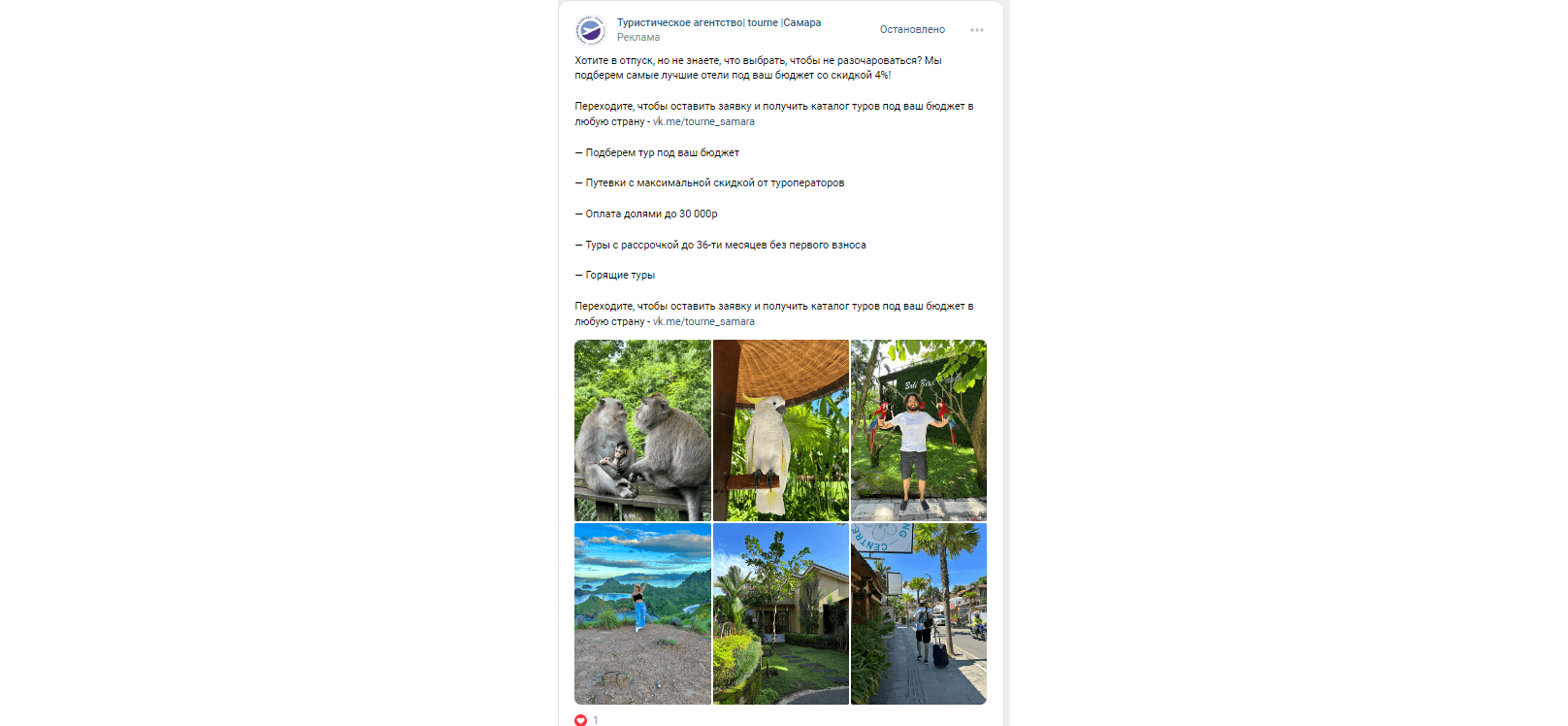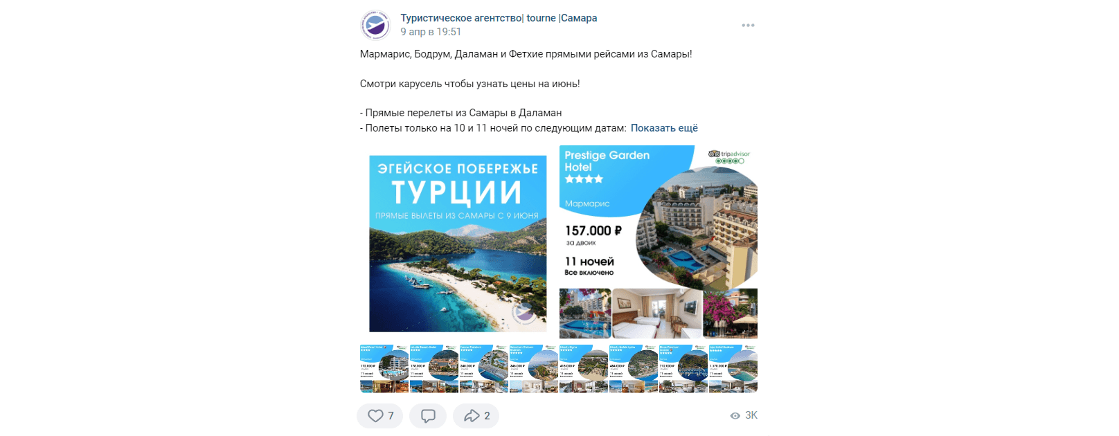 Контент нужен, чтобы рассказать о выгодах туроператора и УТП. Например, клиент предлагал рассрочку на туры и помогал сэкономить десятки тысяч рублей на поездке, благодаря грамотно подобранному маршруту и знанию нюансов каждого путешествия. Этот тип контента — продающий. С ним важно не переборщить, такого контента должно быть не более 20%.