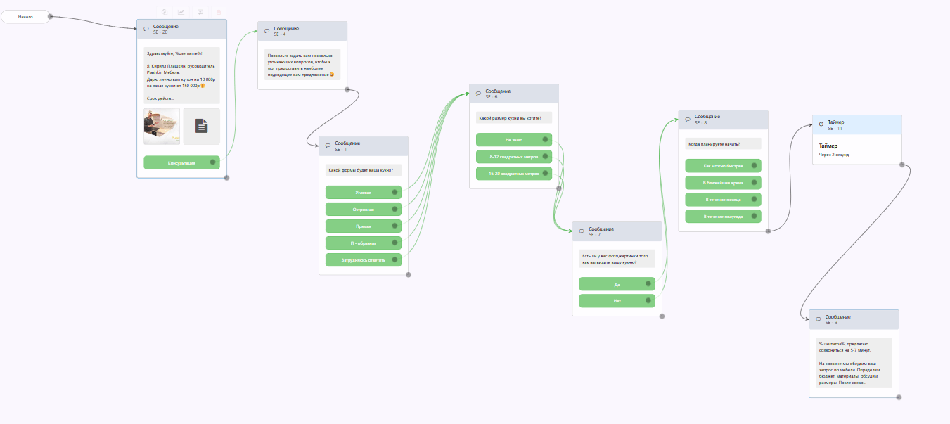 — Оптимизация алгоритмов. Подбор системы для чат-бота стал важным этапом. Наша цель заключалась в том, чтобы каждый лид доводился до замера или оставления контактного номера. Итоговая воронка позволила не только генерировать теплые лиды, но и стимулировать диалог, а впоследствии — продажи.