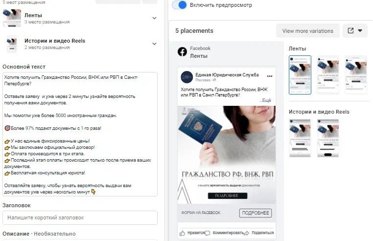 Использовали яркие креативы в графике для большего привлечения внимания. Указывали рекламируемые услуги ярко, чтобы можно было сразу понять о чем в рекламе идет речь + на креативы добавляли фото документов.