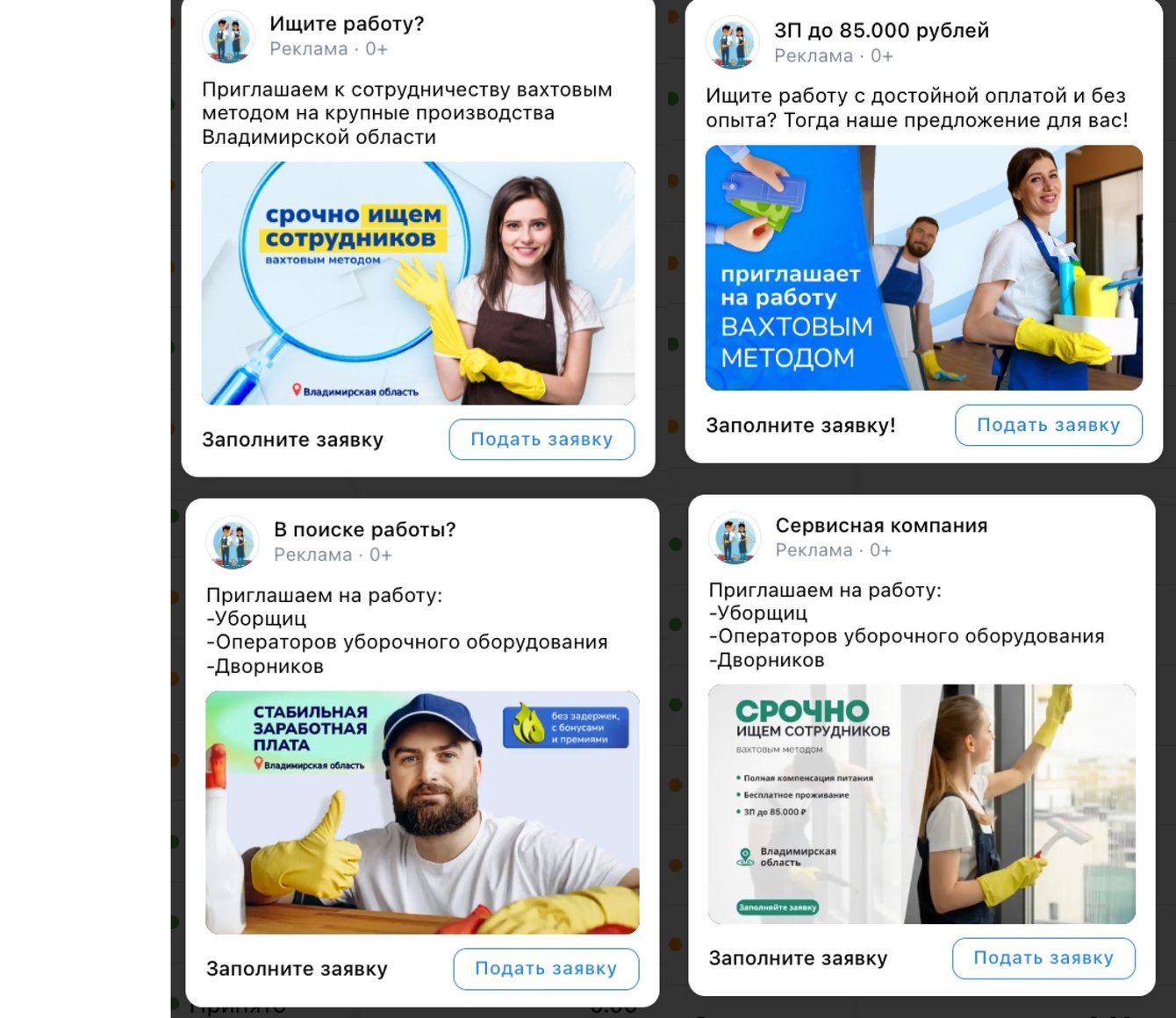 За время работы было разработано 12+ креативов. Протестировано 33 объявления на разные аудитории по фразам, интересам, группам конкурентов, на аудитории групп с тематикой вахтовой работы.