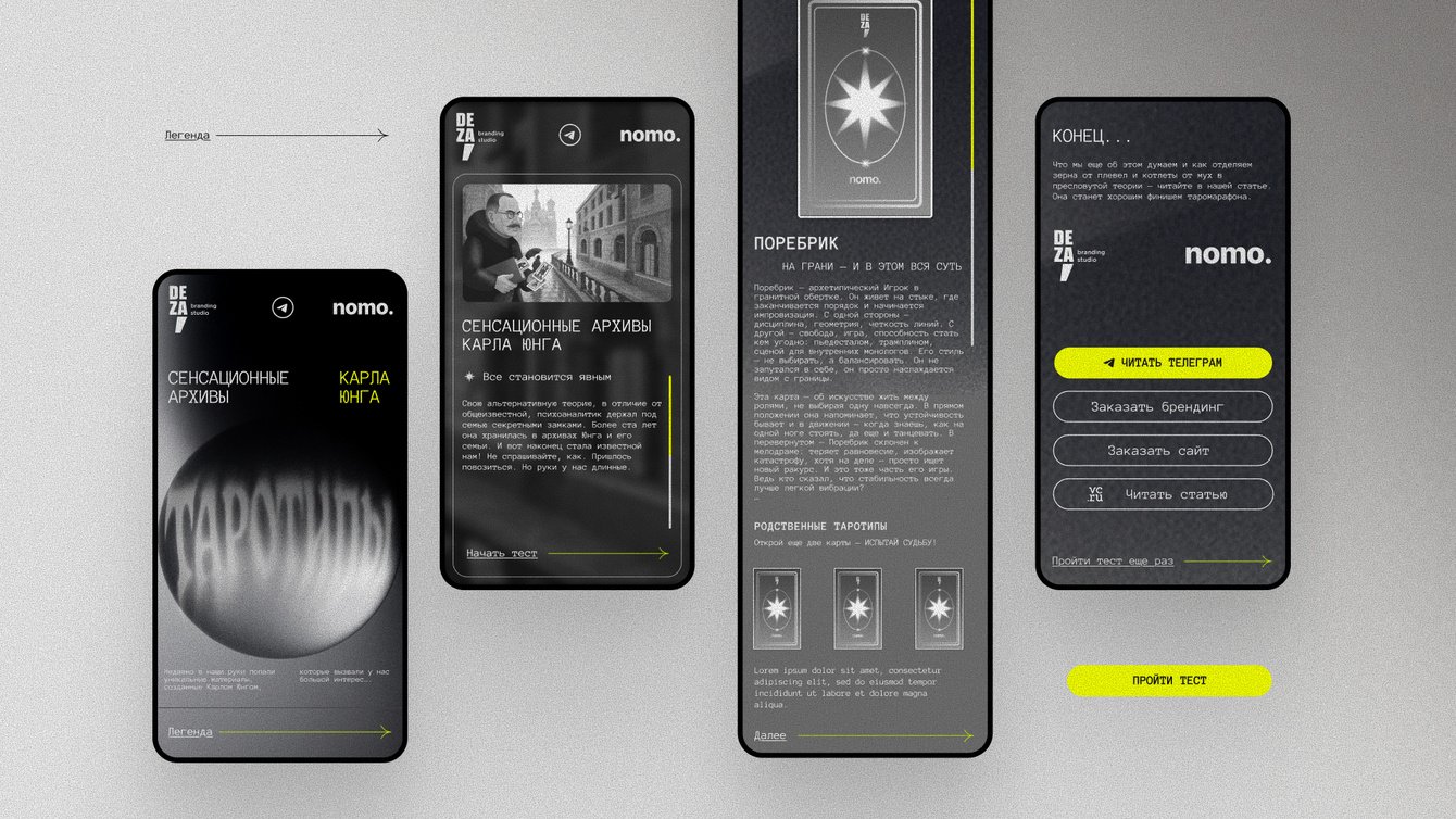 При этом выпадающие после прохождения теста Таротипы были рандомными — от ответов на вопросы итог совершенно не зависел. Так мы хотели показать подобную произвольность результатов брендинга, когда он лишен грамотной стратегической части. И выражали ту самую мысль, что любой архетип подойдет любому человеку или бренду — вопрос в подаче и обосновании.