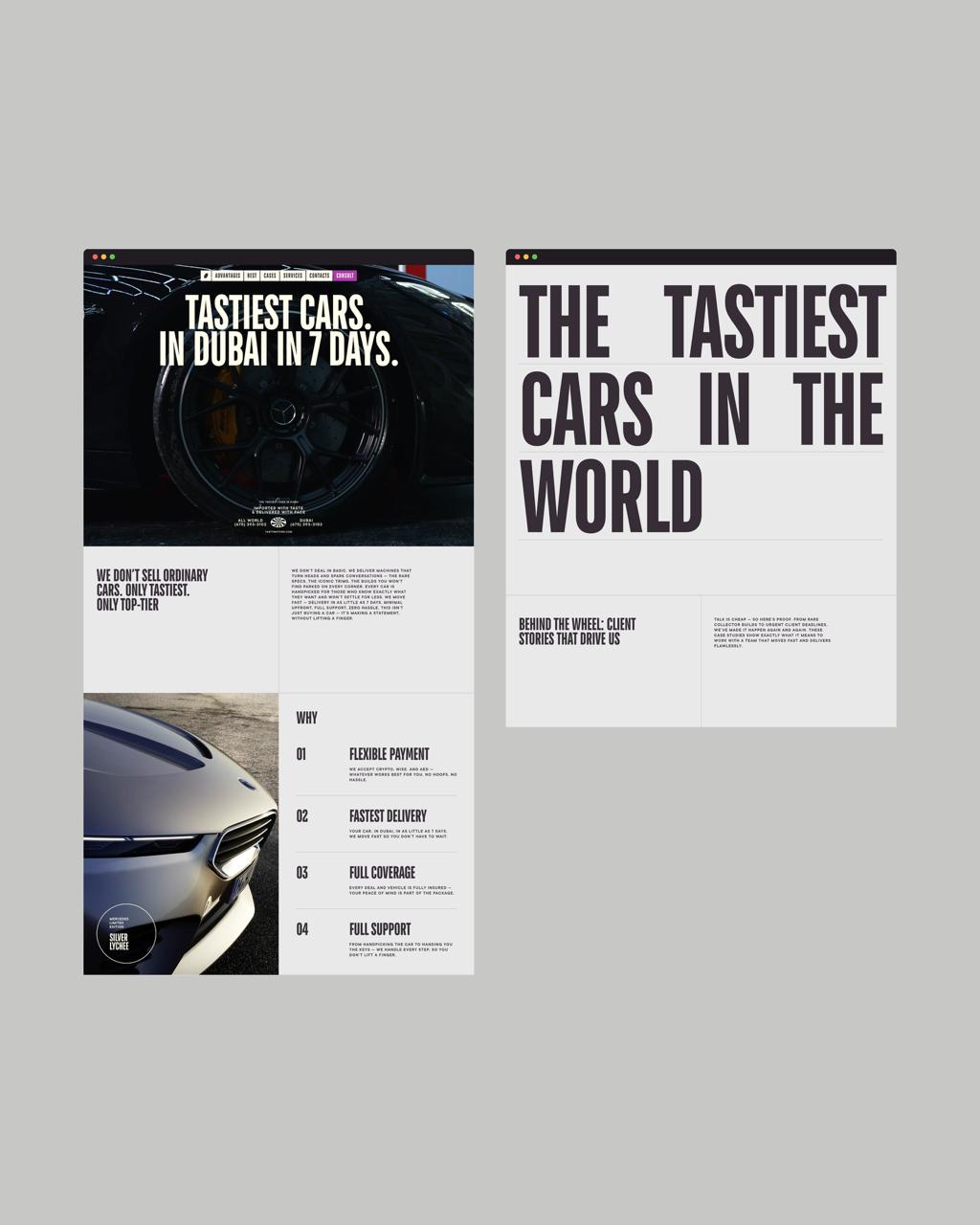 Tasty Motors — сервис по доставке люксовых авто со всего мира в ОАЭ. Причем это автомобили не классического тяжелого люкса (кожаные кресла, чёрное с золотом и т.д.) — а модели с современным и даже дерзким дизайном. В общем, реально тейсти авто 🔥