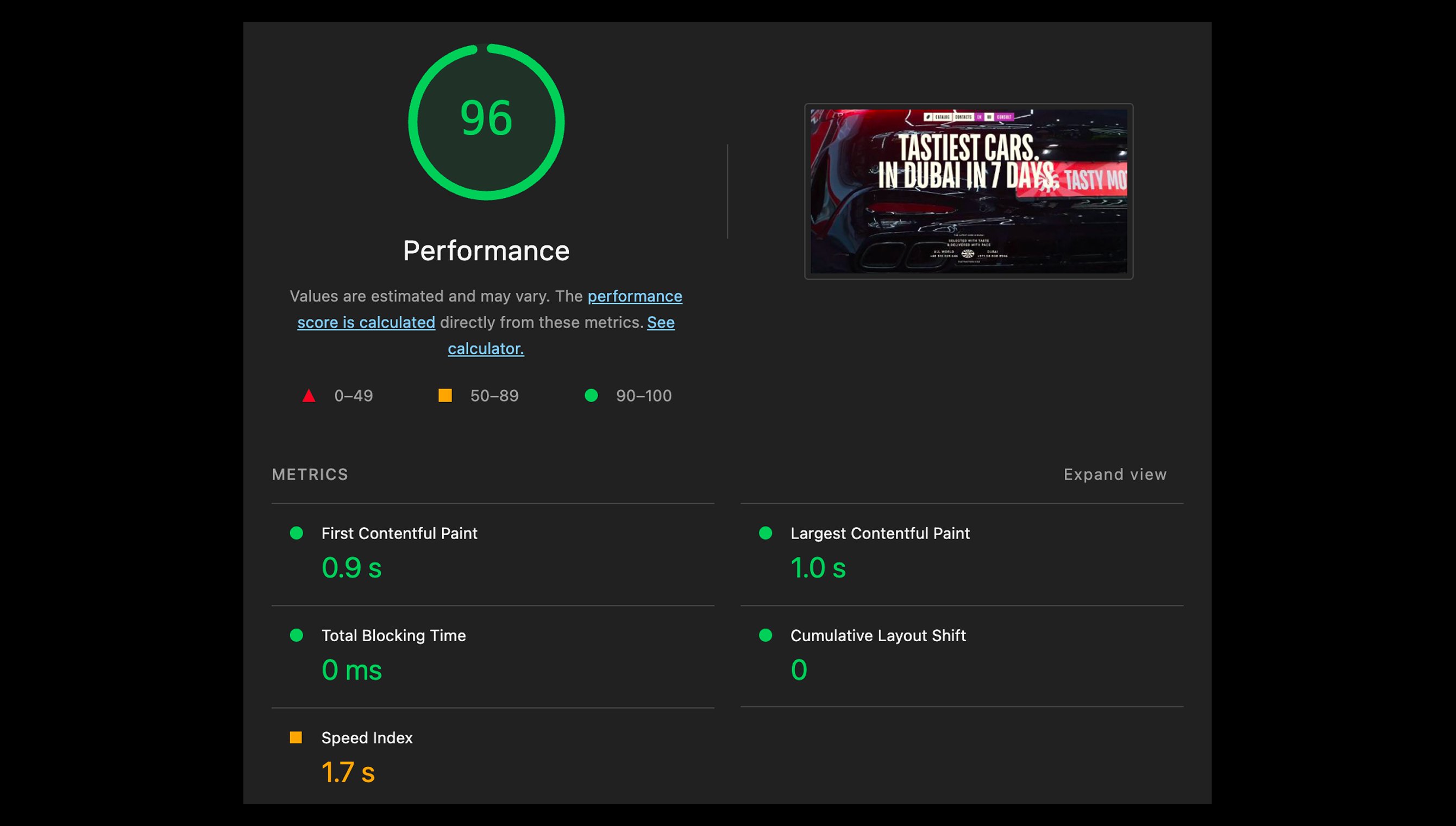 Благодаря нашей работе скорость загрузки сайта сейчас — 96/100 по Lighthouse. Это значительно превышает средние показатели e-commerce сайтов (40-70/100 по Lighthouse) и соответствует уровню топовых люксовых платформ.
