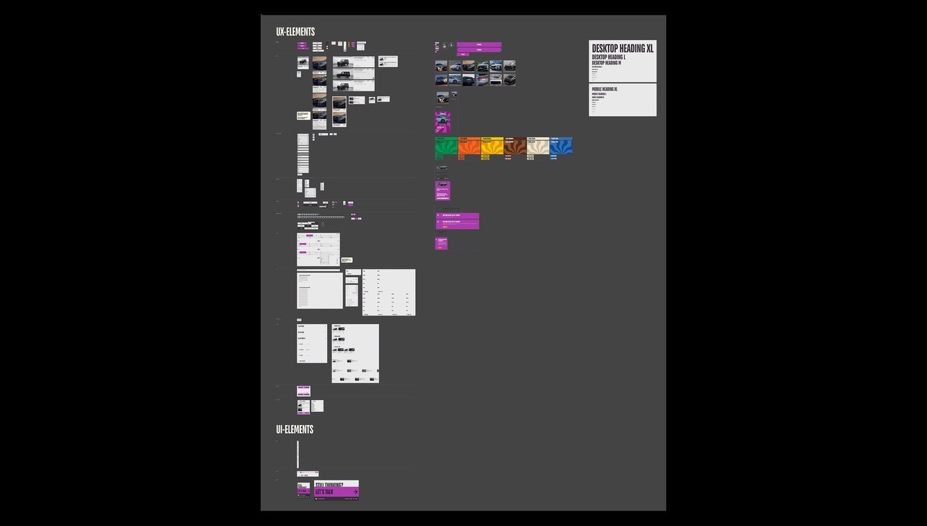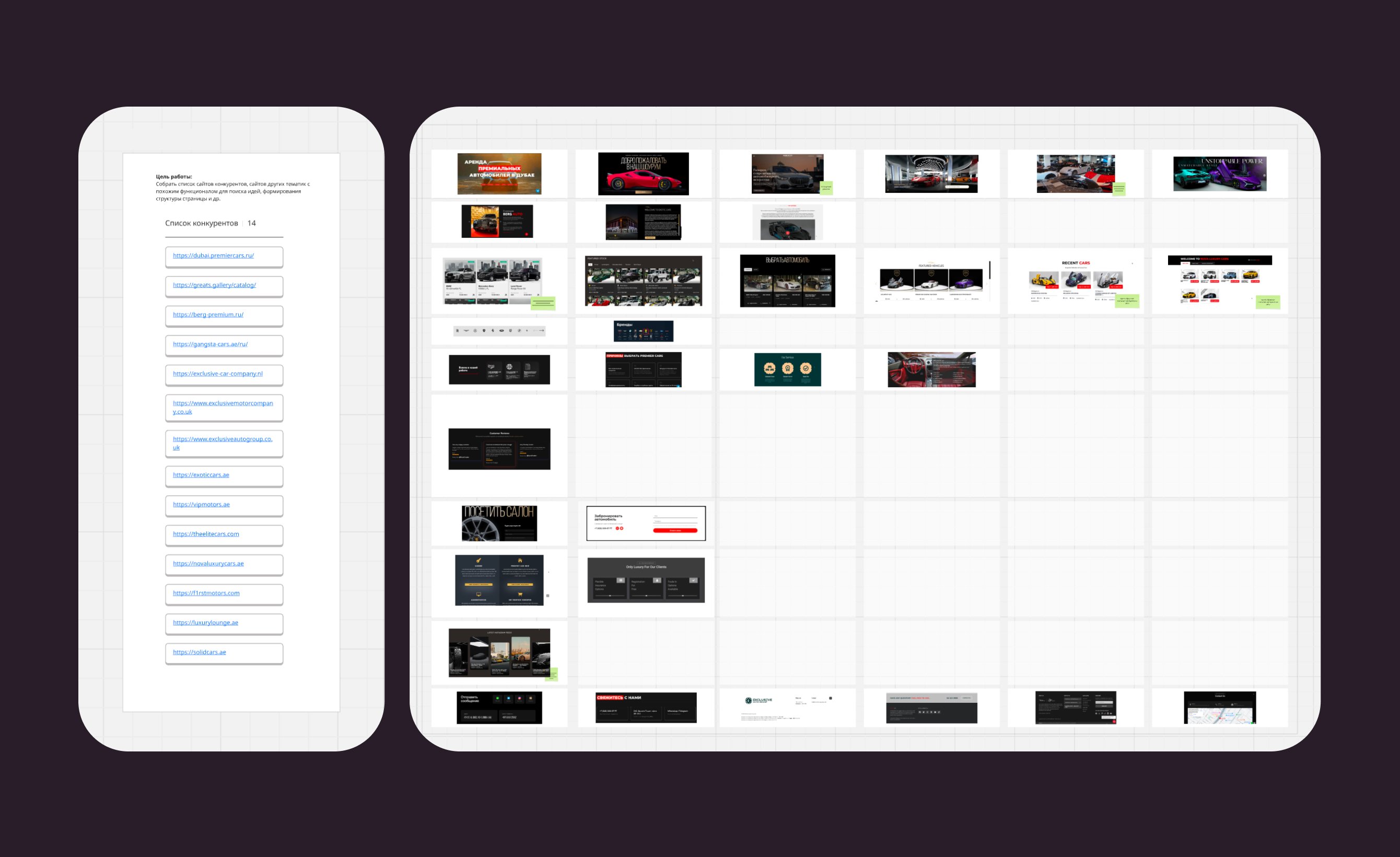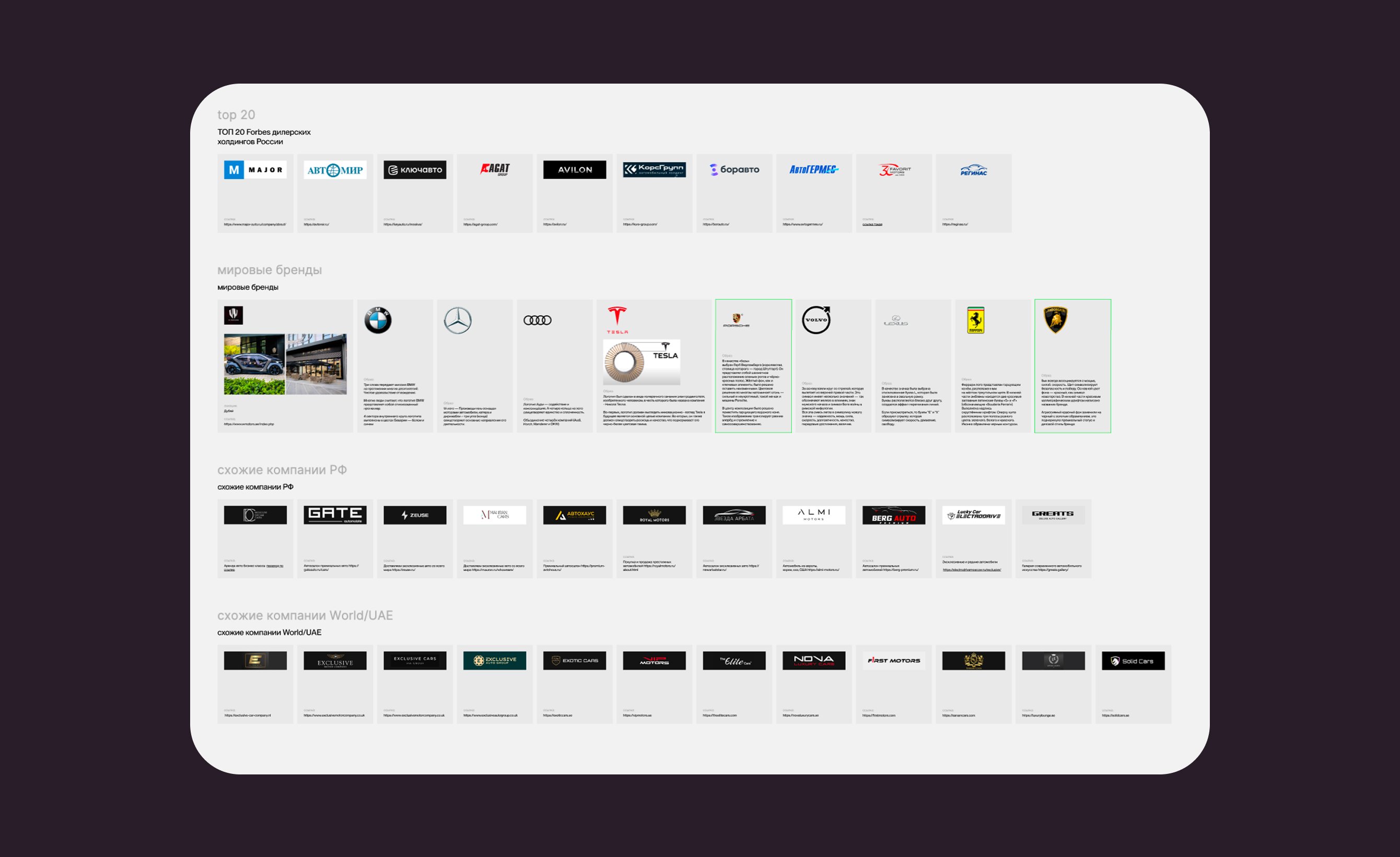 Следующий этап — конкурентный анализ. Мы собрали матрицу прямых конкурентов Tasty Motors, дилеров люксовых авто в ОАЭ. А также изучили сайты из смежных категорий и с похожей логикой выбора и покупки. Благодаря этому собрали инсайты и референсы визуалов и функционала для нового сайта.