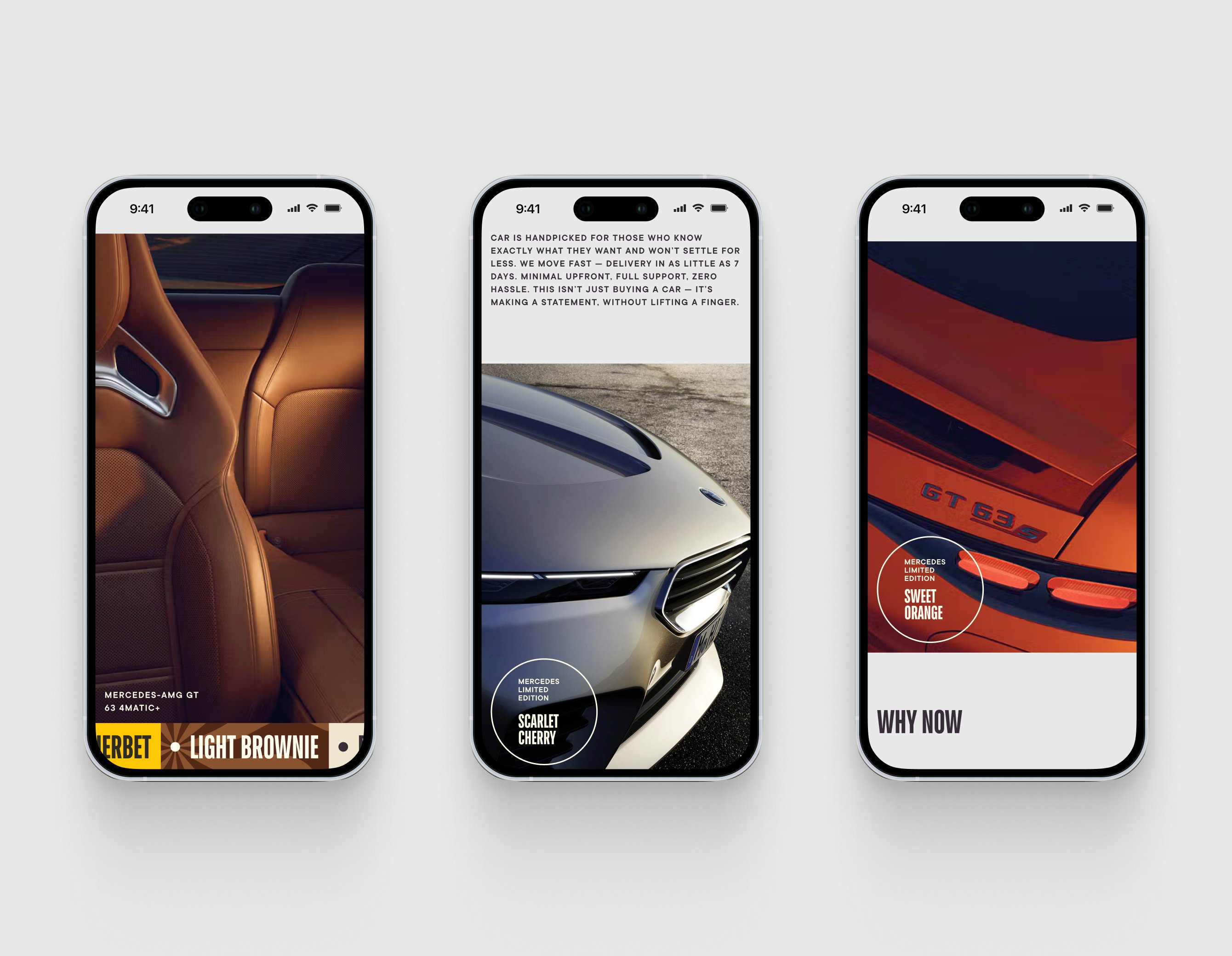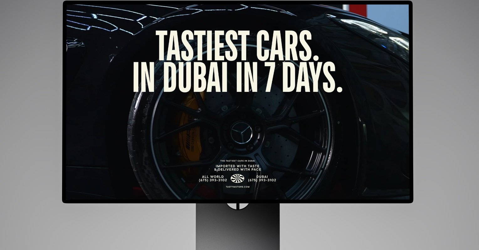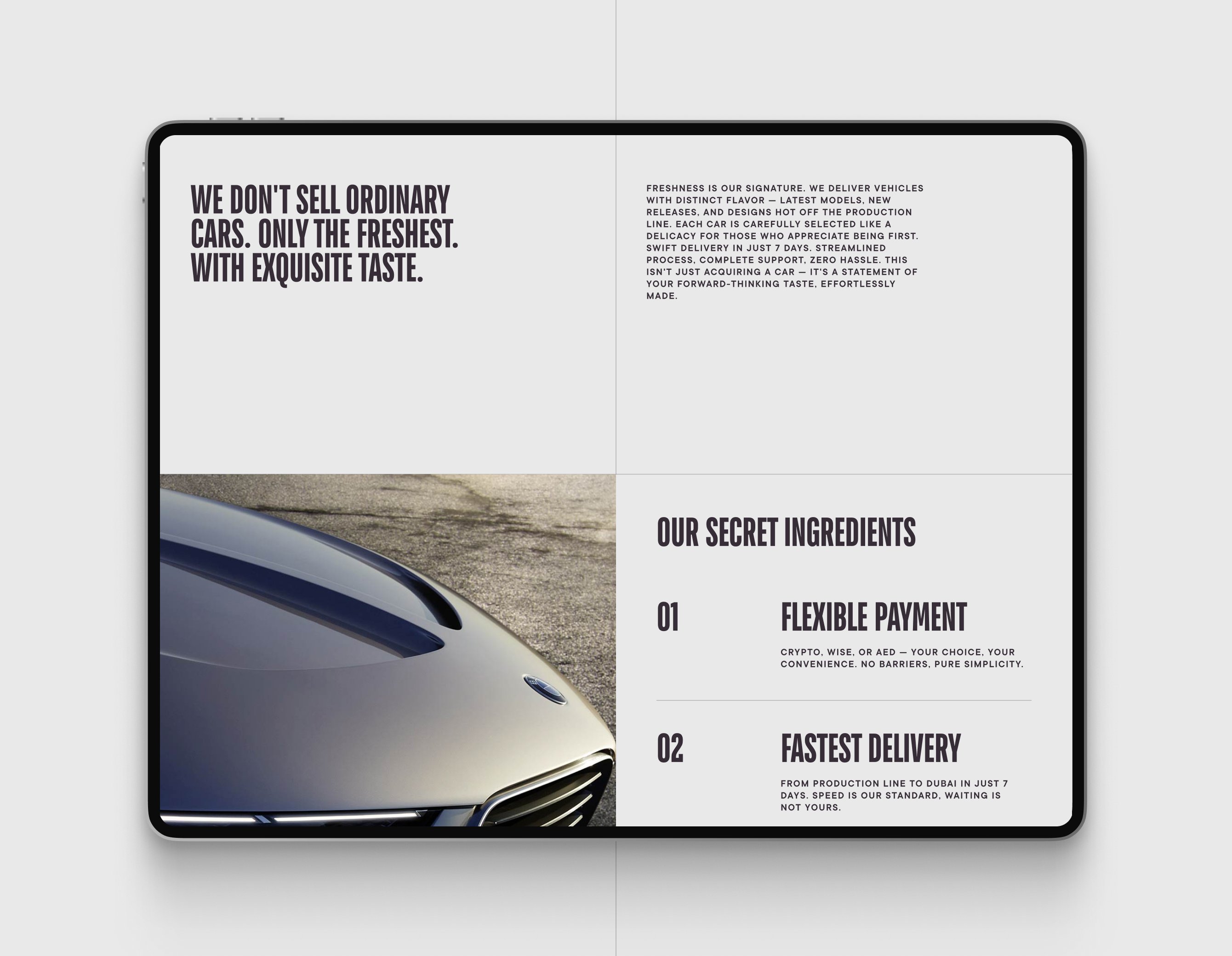 Tasty Motors — сервис по доставке люксовых автомобилей со всего мира в ОАЭ. Причём это не классический тяжёлый люкс (кожаные кресла, чёрное с золотом и т.д.) — а модели с современным и даже дерзким дизайном. В общем, реально «тейсти» авто. Tasty Motors ориентируется на премиум-сегмент: клиентов, которым важны статусность авто и те смыслы, которые в него заложены.