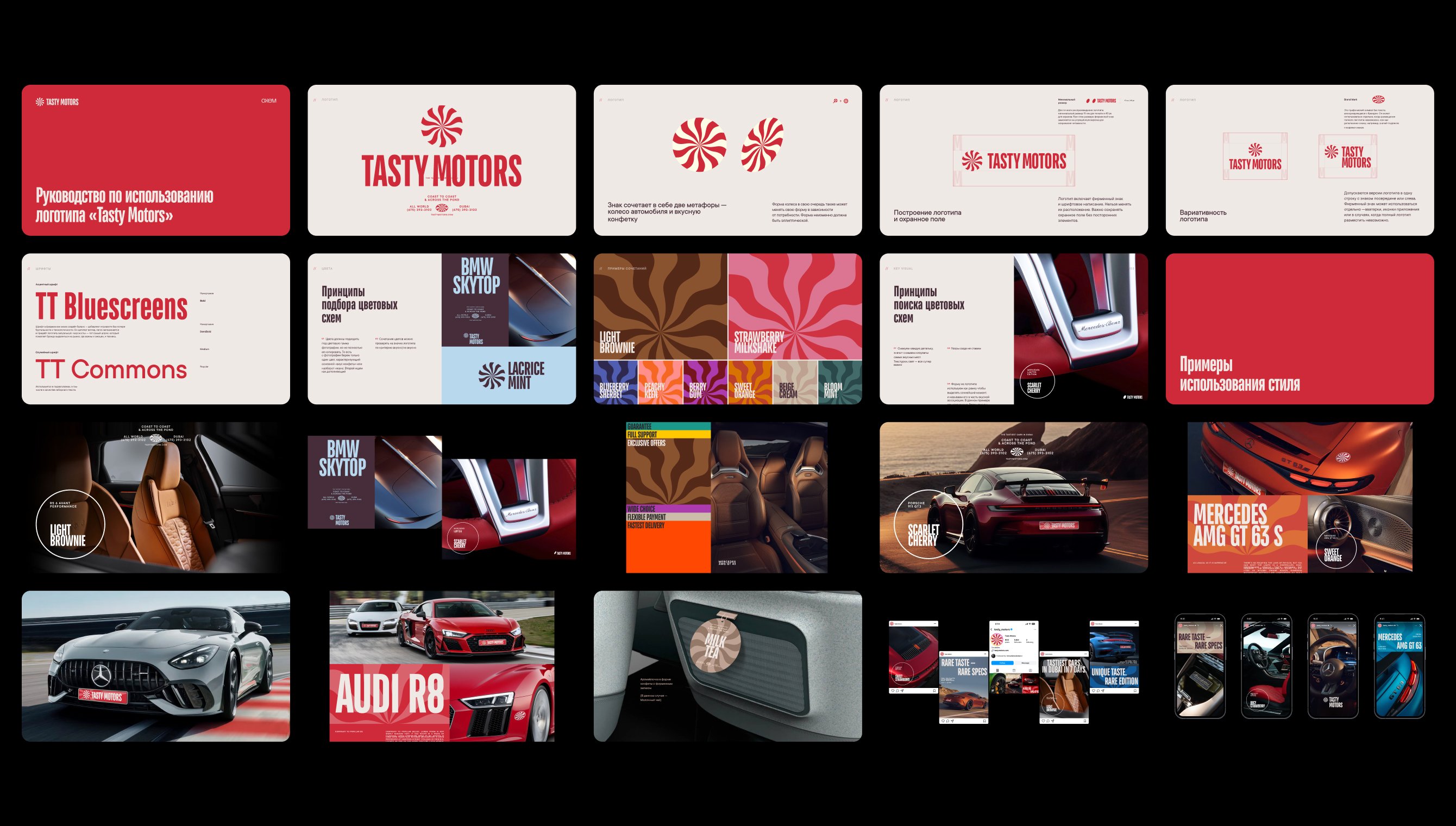 Параллельно с этим изучили ценности и смыслы, которые вкладывают в свою айдентику премиальные автопроизводители, чтобы визуальная система Tasty Motors гармонично перекликалась с ними и не создавала диссонанса у целевой аудитории.