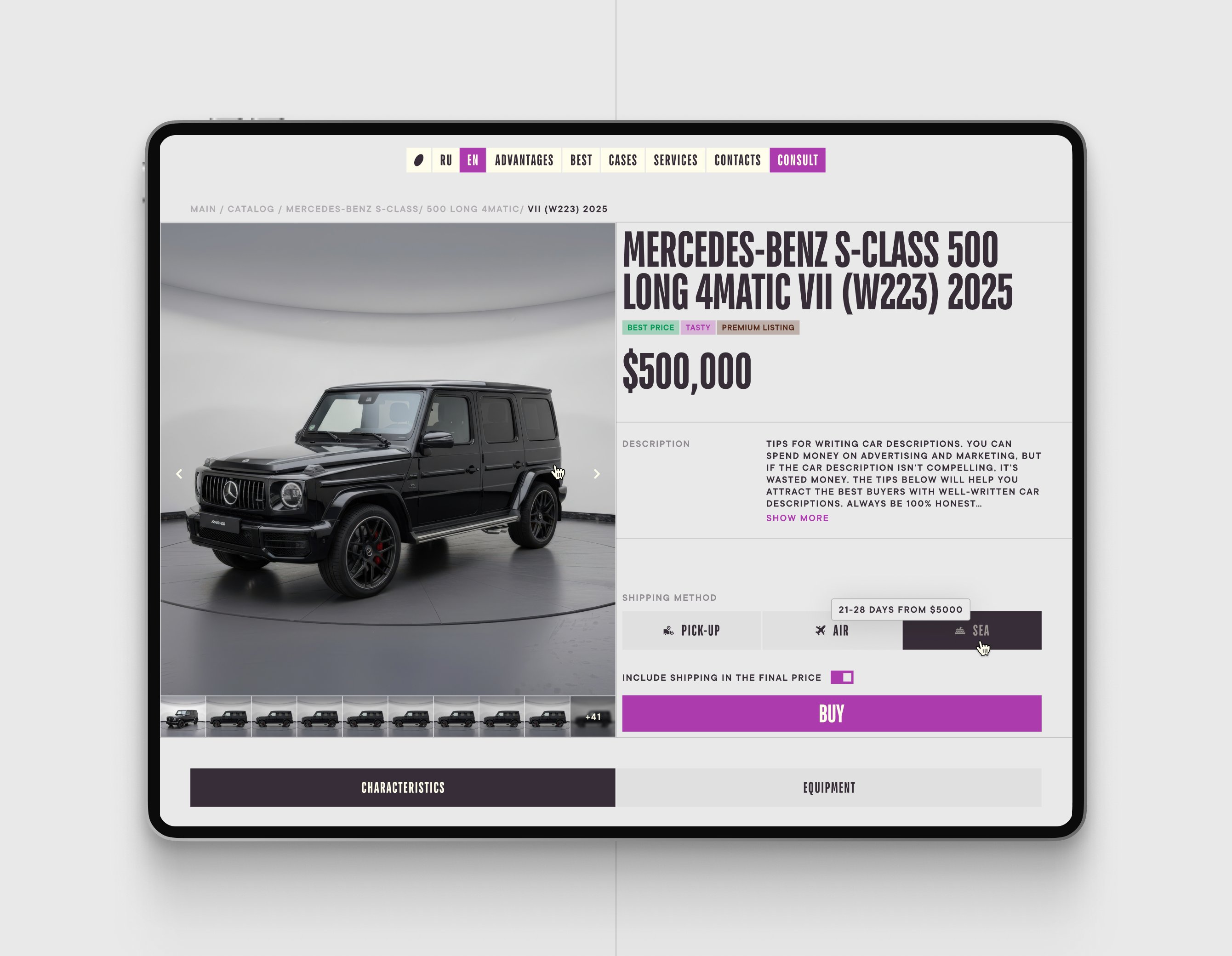 2. Сделали сайт Tasty Motors удобным для многокультурной целевой аудитории. С самого начала отрисовали 2 версии сайта: русскоязычную и англоязычную, а цены указываем в долларах.