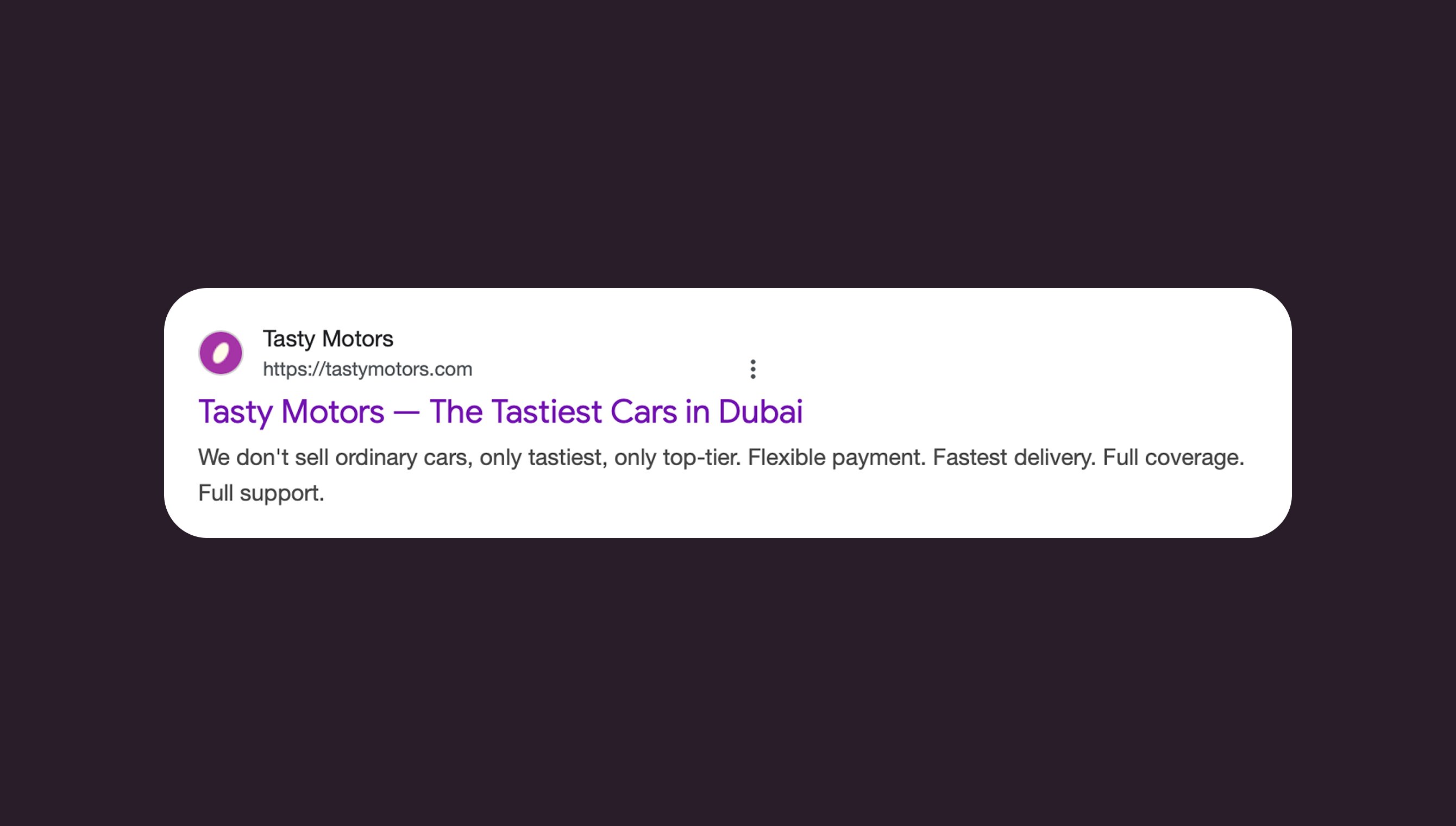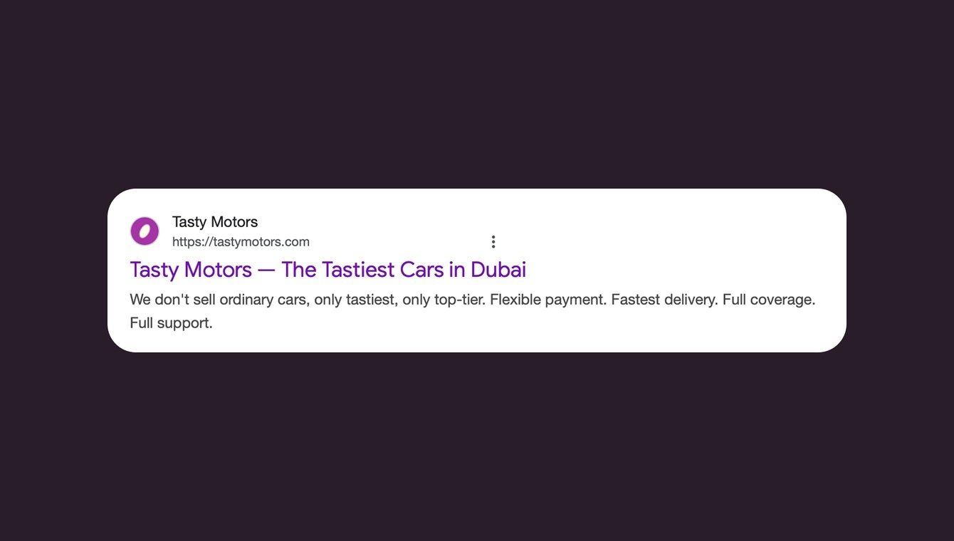 Также вывели ценности бренда Tasty Motors в description сниппета в поисковике.