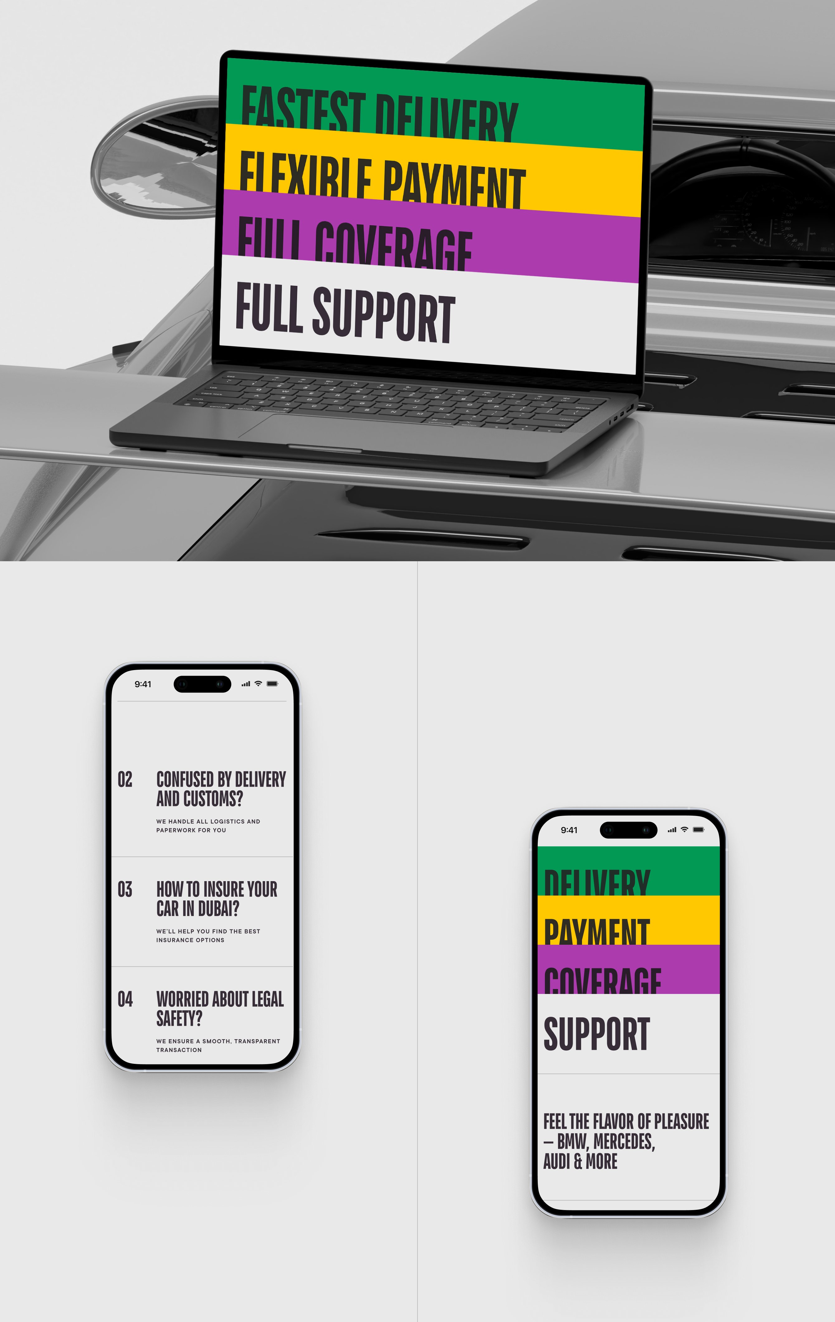 ✔️ Результат продуктового исследования показал: для лидерства Tasty Motors на рынке ОАЭ бренд должен радикально отличаться от конкурентов — сочетать выразительность, дерзкий характер и премиальное качество подачи. Одновременно сайт должен поддерживать ключевые преимущества компании: прозрачность процессов, высокий уровень сервиса и персонализированный подход — и помогать пользователю быстрее принимать решение обратиться в компанию.