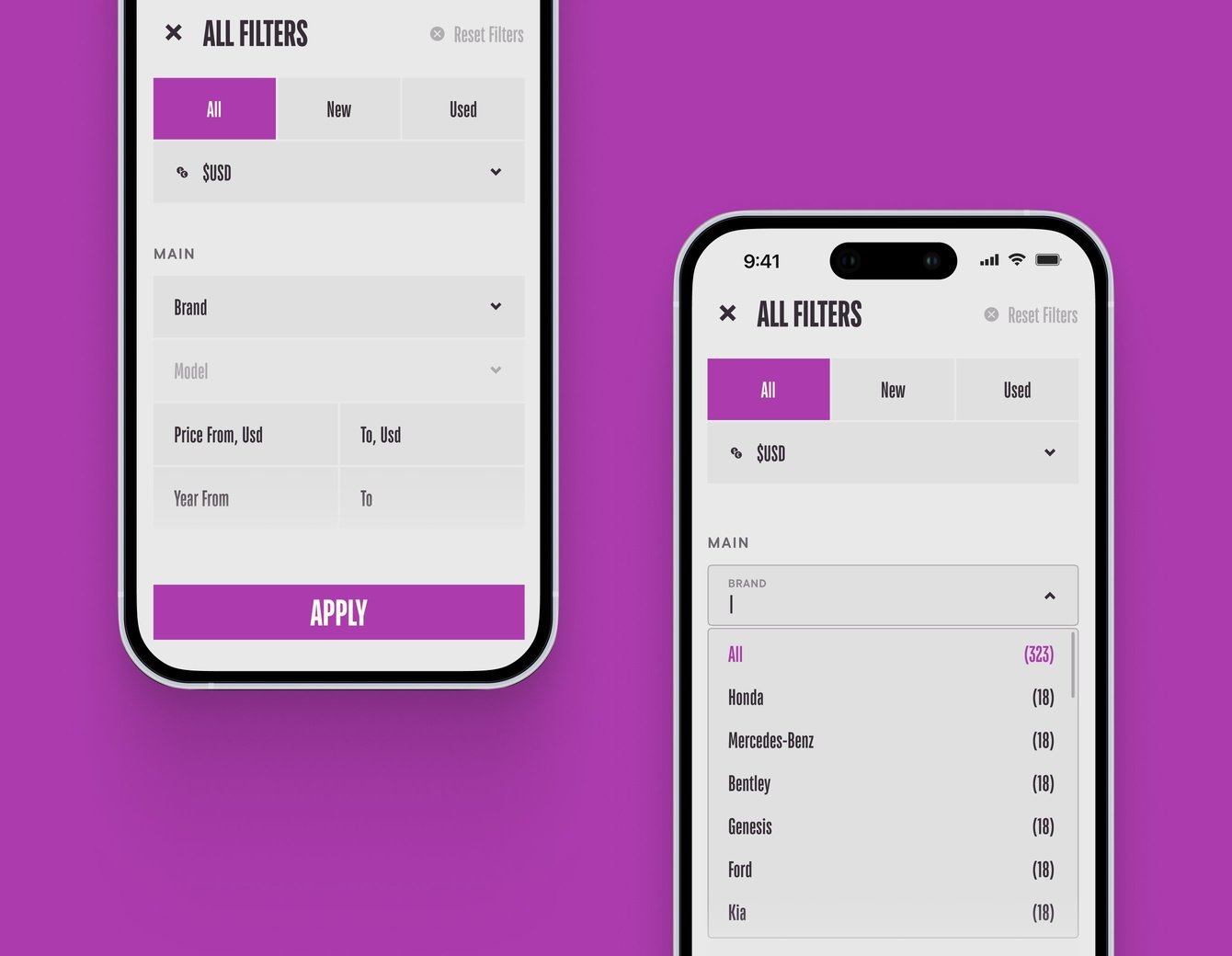 Добавили возможность поиска по фильтрам: теперь пользователь может легко найти конкретную марку или модель, нужный пробег авто, стоимость, вид двигателя и статус (новую или с пробегом).