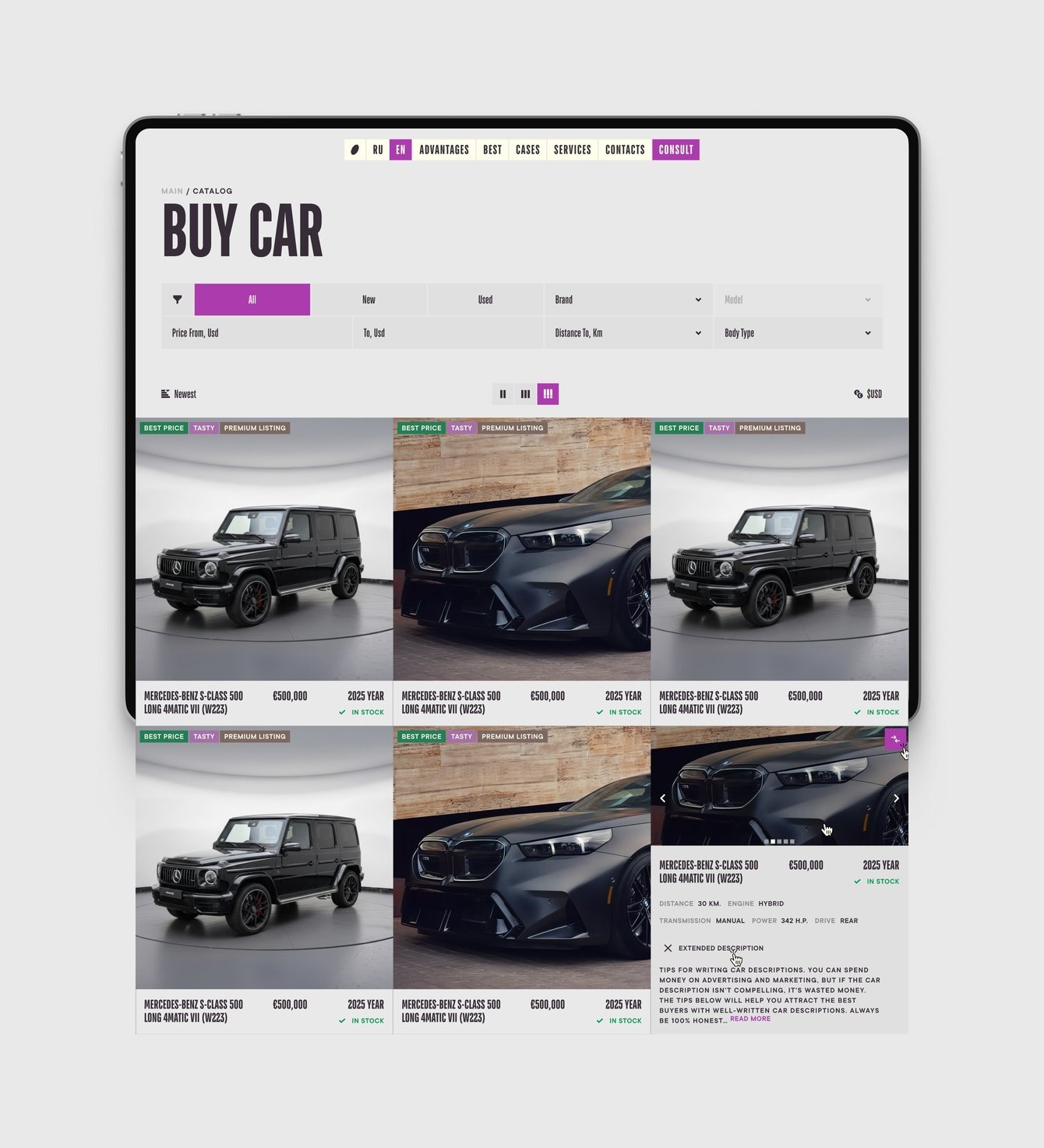 После запуска мы продолжаем развивать сайт Tasty Motors: сейчас основной фокус нашей команды на расширении каталога автомобилей и оптимизации мобильной версии.