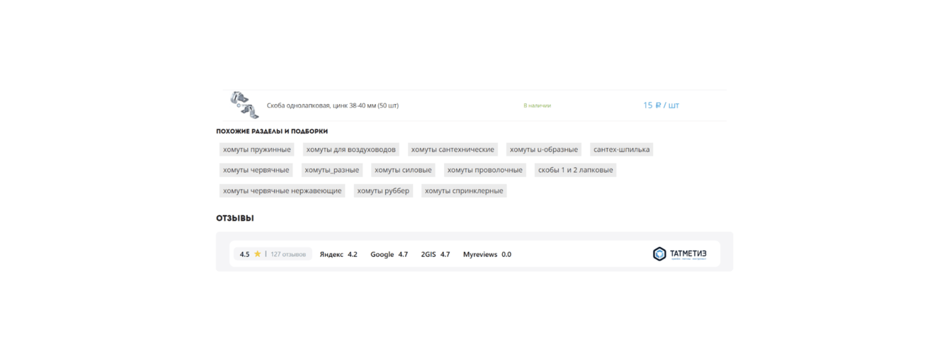 Для сегмента b2c мы сделали подробные товарные карточки с фото и отзывами, добавили информацию о совместимости крепежа и создали раздел с акциями. «Татметизу» приходится бороться за частных покупателей с маркетплейсами: нам было важно выиграть и в цене на товары, и в качестве контента.