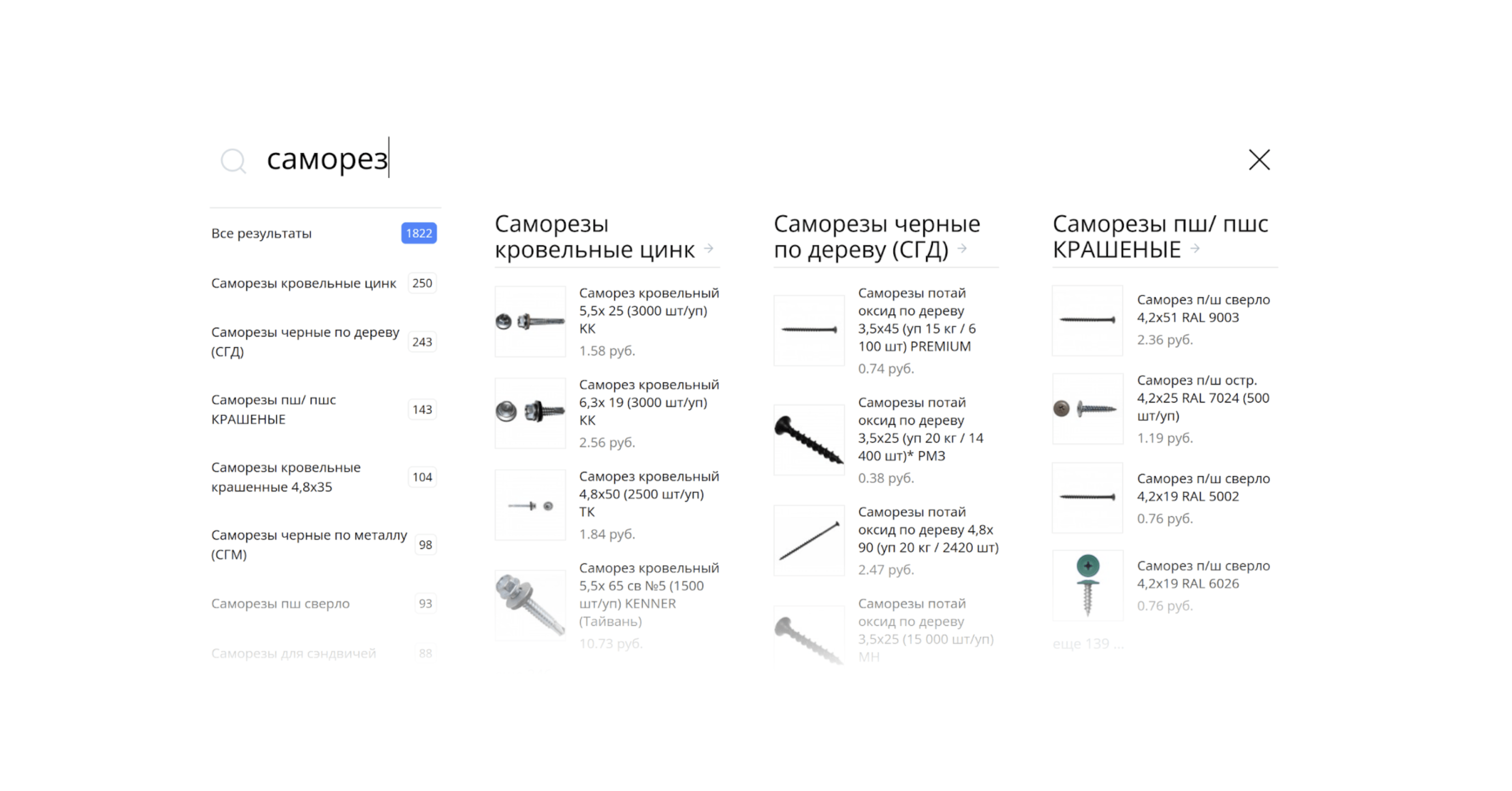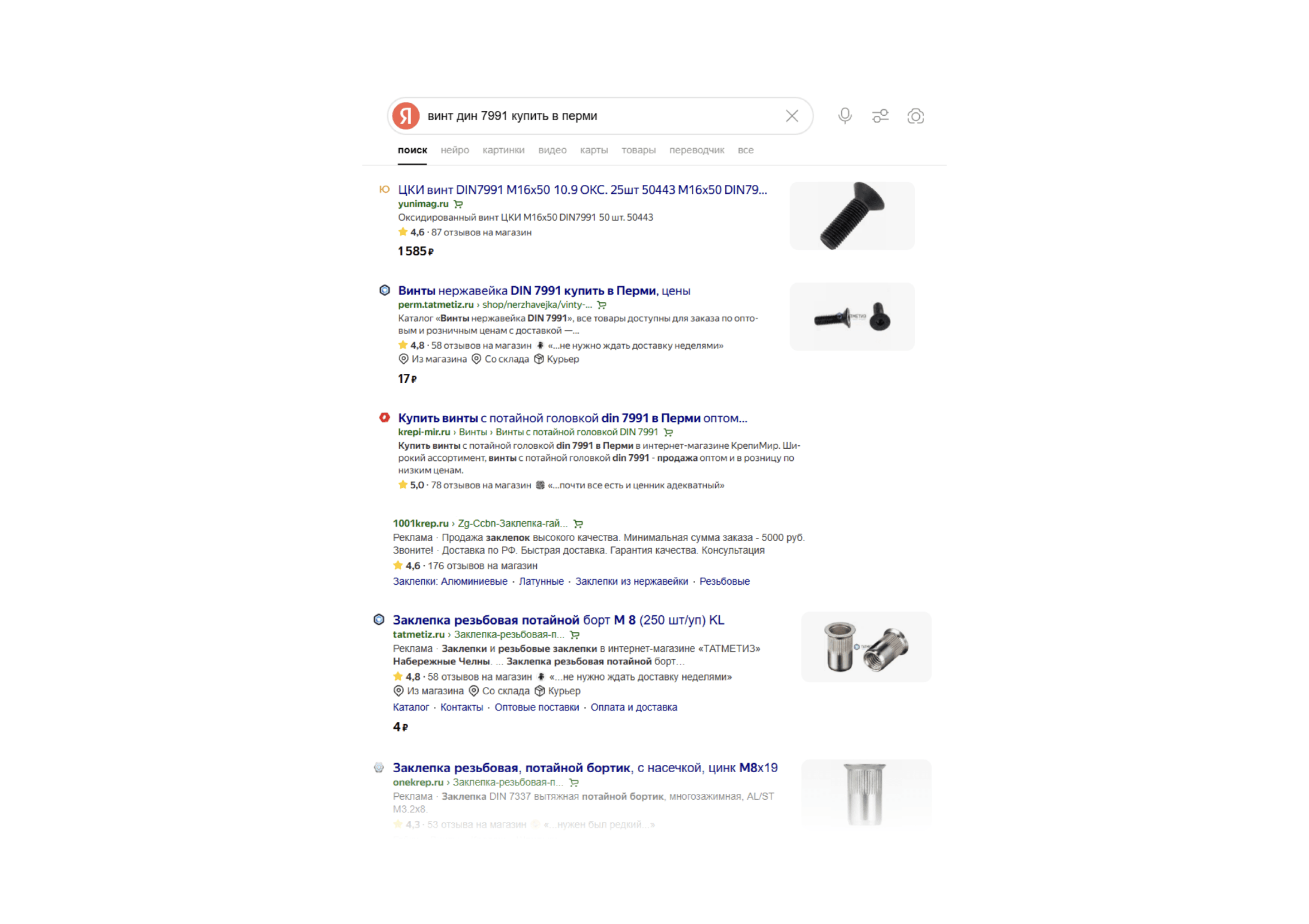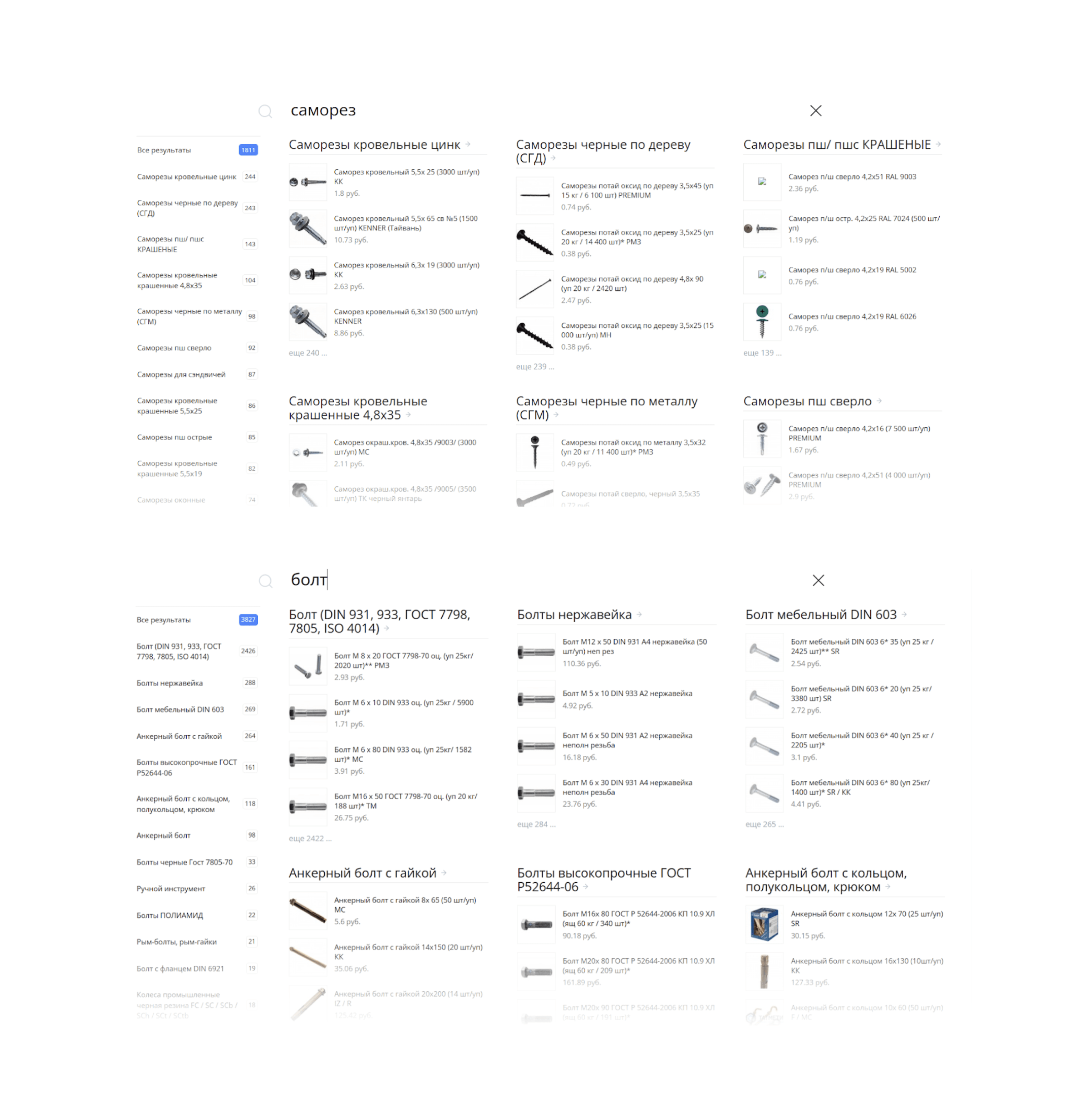 Результат: в магазине появились недостающие категории, подкатегории и посадочные страницы с подтвержденным спросом. Под популярные срезы фильтра мы создали динамические страницы. Также появились срезы по брендам, назначению, типам и размеру крепежа.