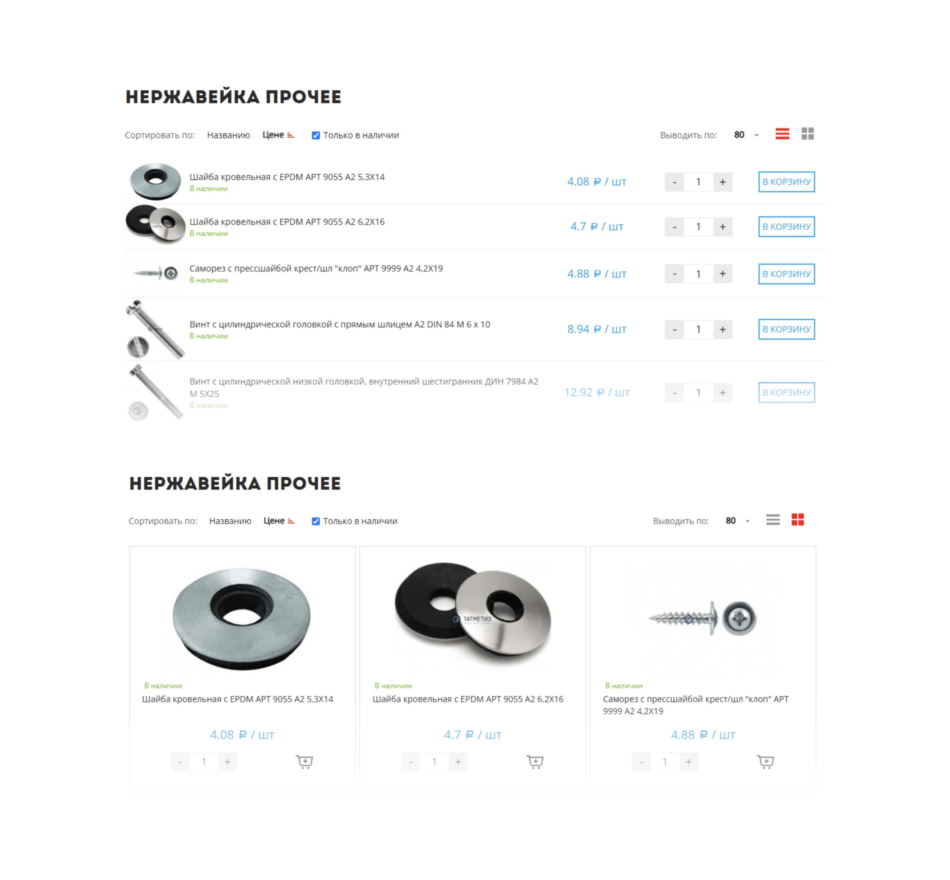 Для отображения листингов сделали два шаблона: списком и карточками. Добавили сортировку по названию, наличию и цене.