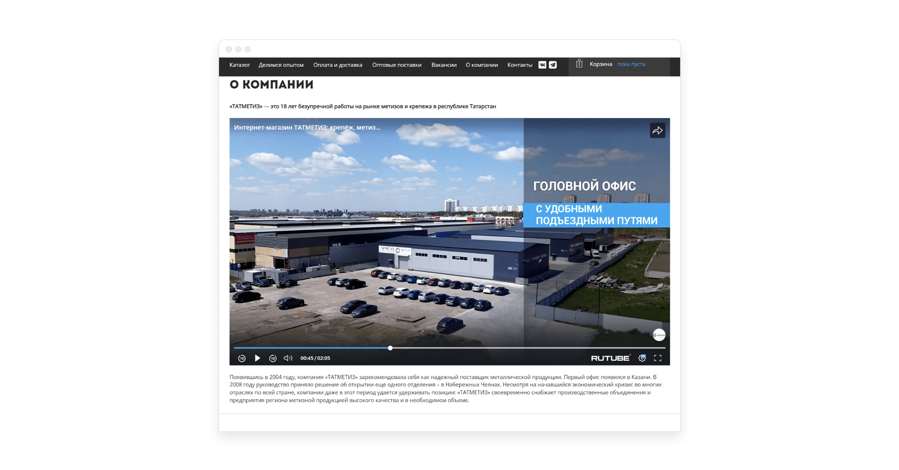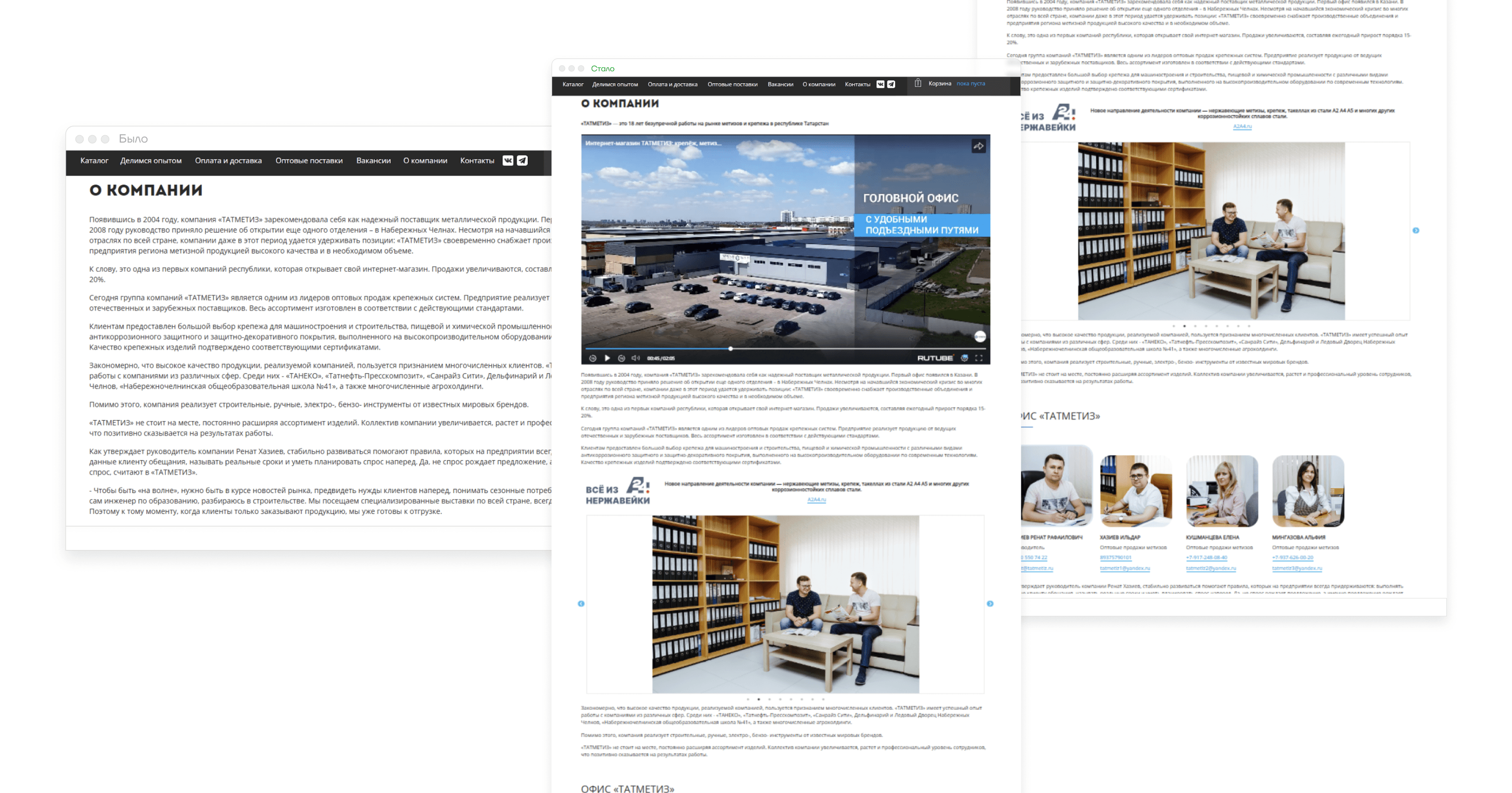 У нас на руках уже была карта пути клиента: мы знали, что оптовики ценят надежных и постоянных поставщиков. «Татметиз» — крупная сеть магазинов с интересной историей, но это не было отражено на сайте. Страница «О компании» содержала шаблонный текст, который пользователи не читали.