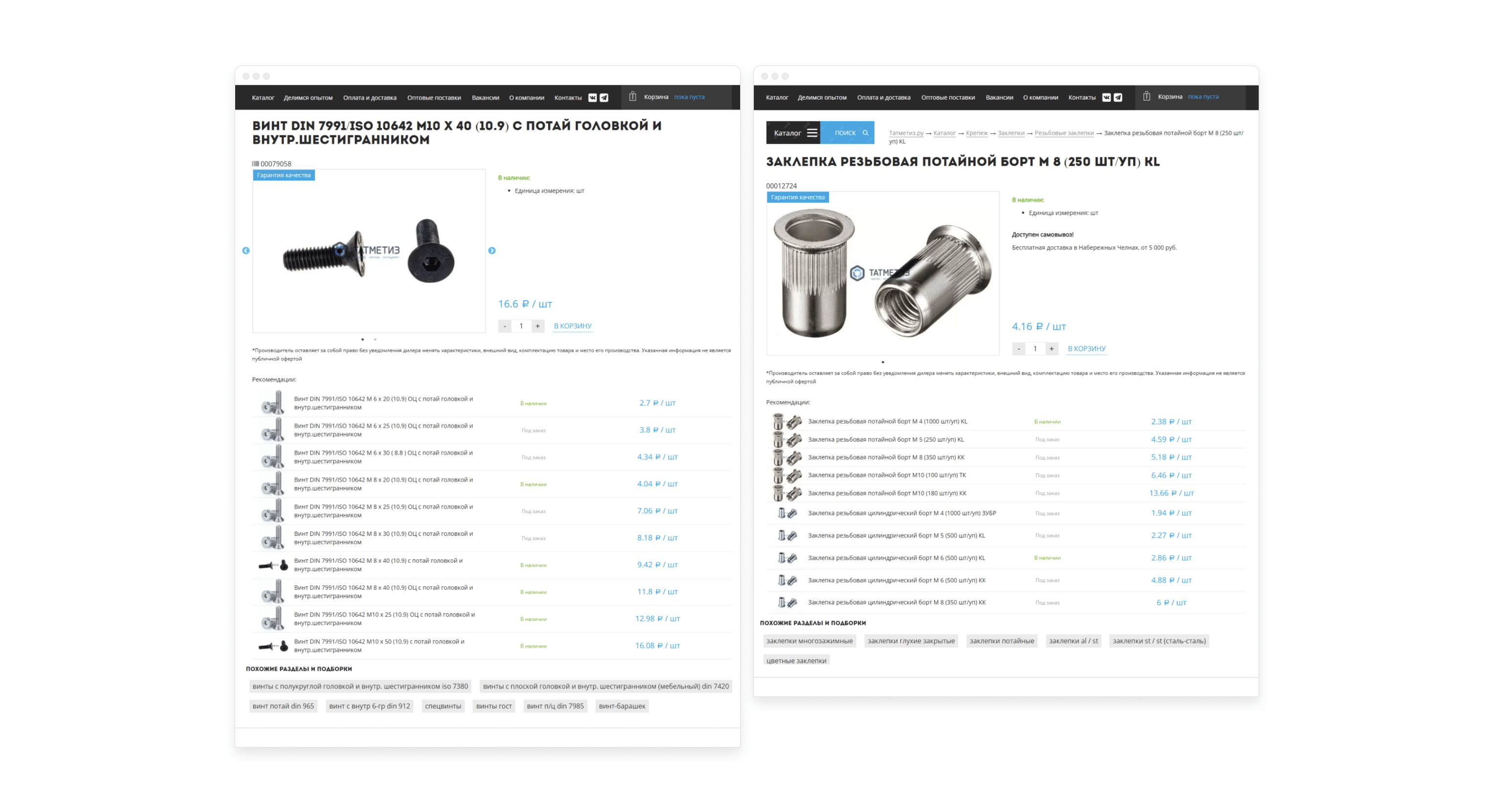 Для сегмента b2c мы сделали подробные товарные карточки с фото и отзывами, добавили информацию о совместимости крепежа и создали раздел с акциями. «Татметизу» приходится бороться за частных покупателей с маркетплейсами: нам было важно выиграть и в цене на товары, и в качестве контента.