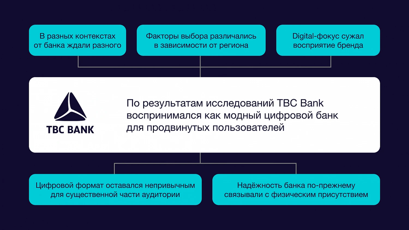Исследования выявили несколько важных барьеров. Во-первых, в регионах банк знали слабее и понимали хуже, чем в столице. Во-вторых, его не всегда ассоциировали с серьёзными банковскими продуктами — кредитами, вкладами, картами и полноценным повседневным банкингом. В-третьих, бренд часто воспринимался как слишком технологичный, сложный и недоступный простым людям. Дополнительным барьером было и то, что часть аудитории воспринимала TBC как иностранный банк, который не до конца понимает местных.