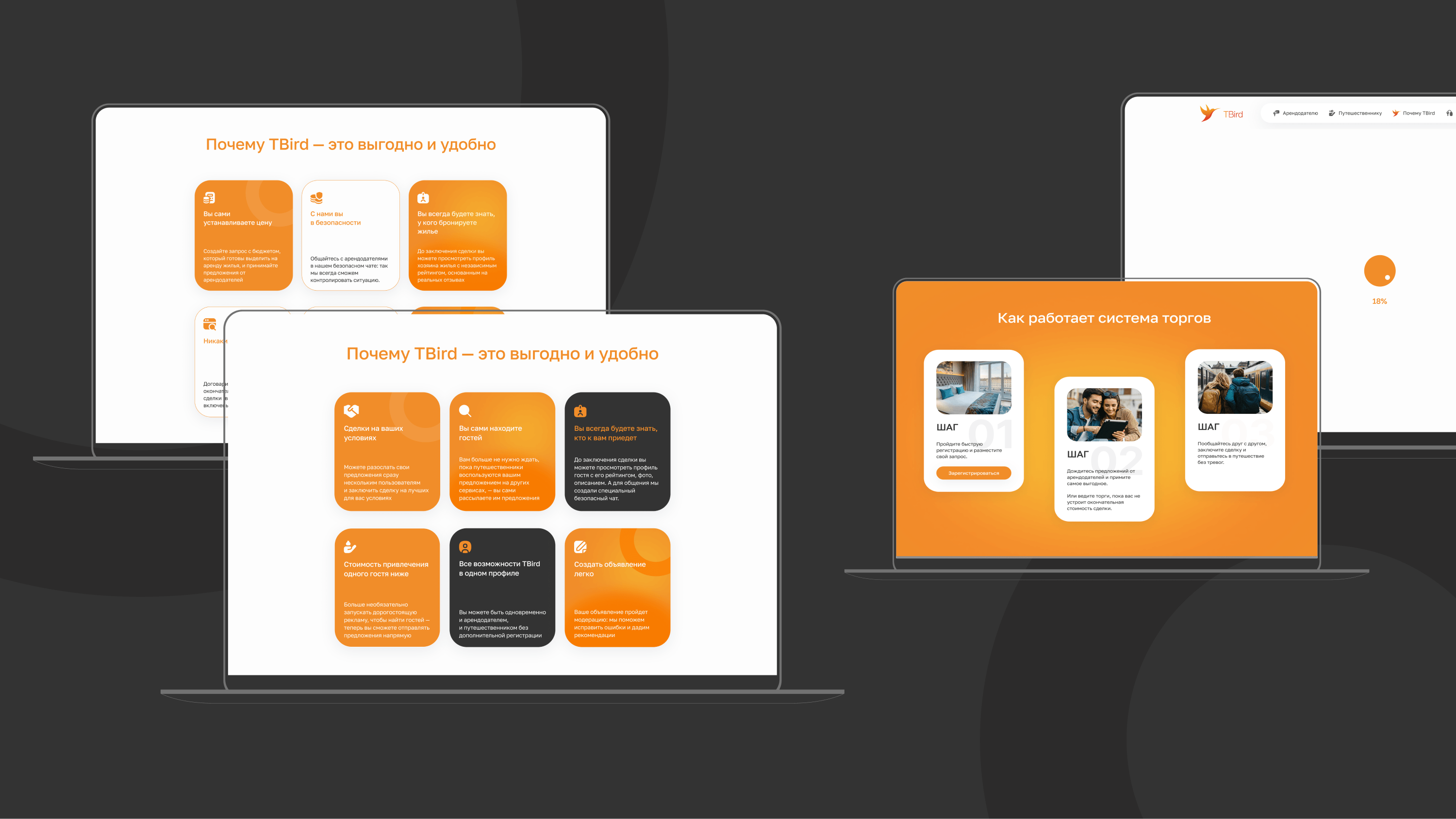 Сайт – полноценный маркетинговый инструмент, который команда TBird в дальнейшем планирует использовать для продвижения. Вместе с маркетинговым агентством Coven, которое как раз будет заниматься этим вопросом, мы проработали структуру каждой страницы. Делали это с упором на эффективное продвижение. Вынесли УТП, оффер и кнопки CTA на первый план. Главная, страницы путешественника и арендодателя в итоге работают как полноценные лендинги, которые подходят для контекста и таргетированной рекламы.