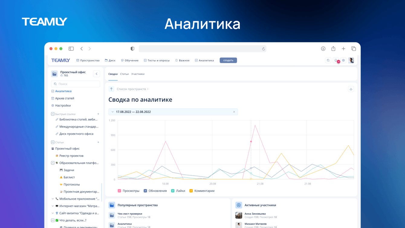 - Аналитика по пространствам и статьям: просмотры, обновления, лайки и комментарии