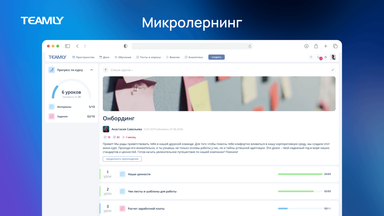 - Функционал курсов для обучения, развития и адаптации сотрудников.