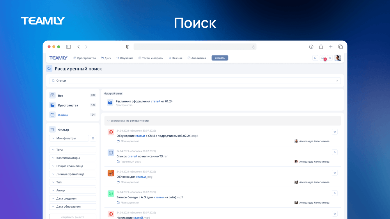 Пользователю будет удобно найти информацию в базе знаний: в отличие от Confluence и Notion, TEAMLY поддерживает морфологию русского языка.