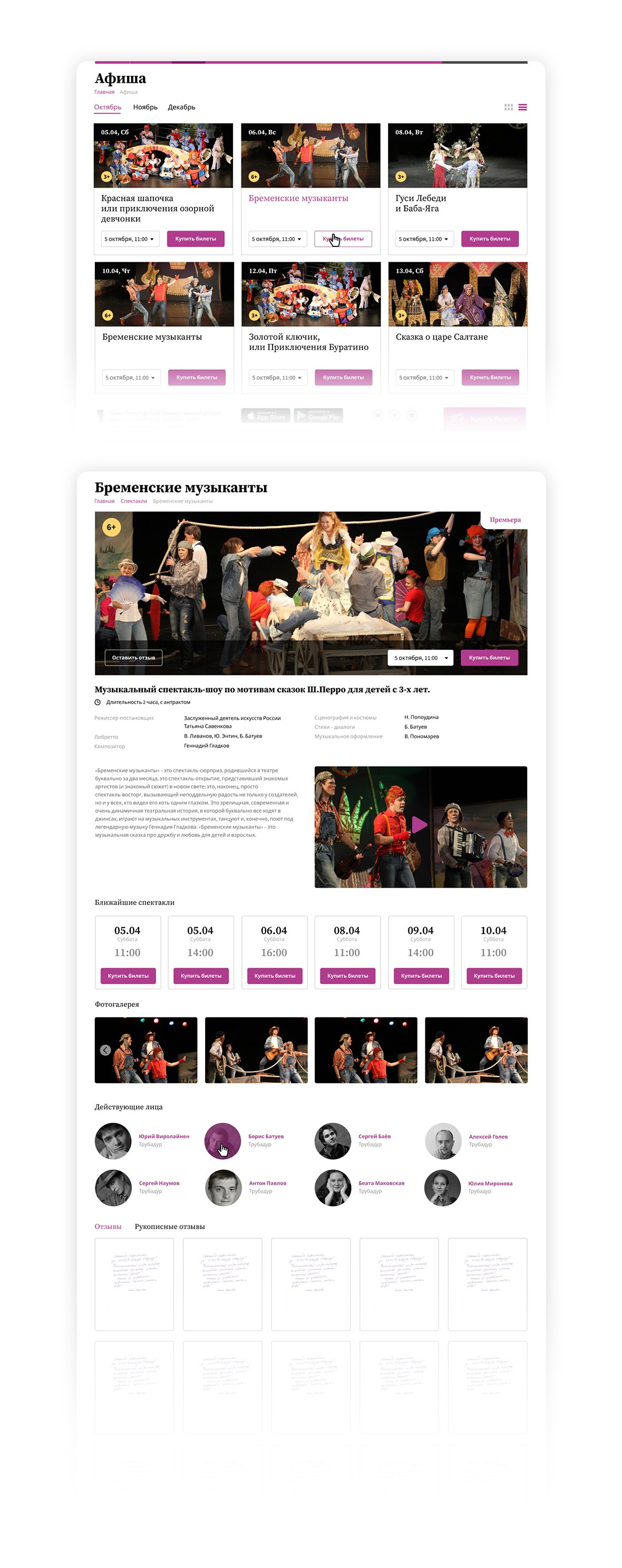 Мы создали легкий, лаконичный сайт, на котором родители могут с удобством выбрать и заказать билеты на спектакли по любимым сказкам своих детей.В афише реализован удобный способ выбора дат спектакля. У каждого спектакля из репертуара театра есть подробная страница с описанием, именами создателей и актеров, отзывов зрителей и фотогалереей. У каждого актера есть личная страничка. Сайт адаптирован под мобильные устройства.